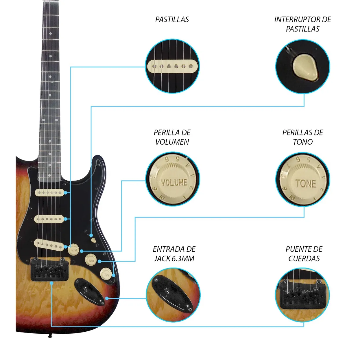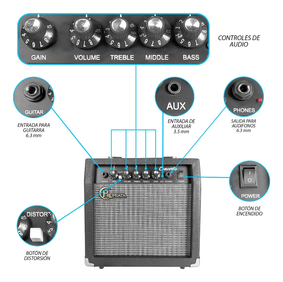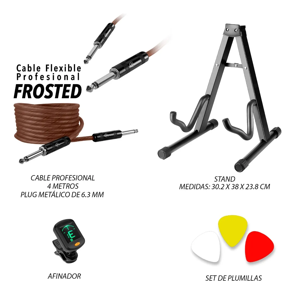 Kit Completo para Empezar: El kit es *todo incluido*, eliminando la necesidad de compras adicionales. Típicamente incluye: un amplificador de práctica compacto, una funda acolchada para transporte, correa cable de instrumento y plumillas Esto permite al músico comenzar a practicar inmediatamente.