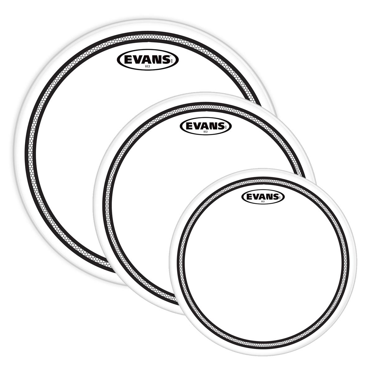 Juego de parches Evans EC2S Clear para tom, configuración: Fusion, diámetro: 10″, 12″ y 14″ pulgadas, fabricados con dos capas de película de 7 milésimas de pulgada, terminado transparente, sistema Edge Control, anillo sintético controlador de armónicos mejora la afinación, ofrece sustain medio y brillantez, hecho en USA.