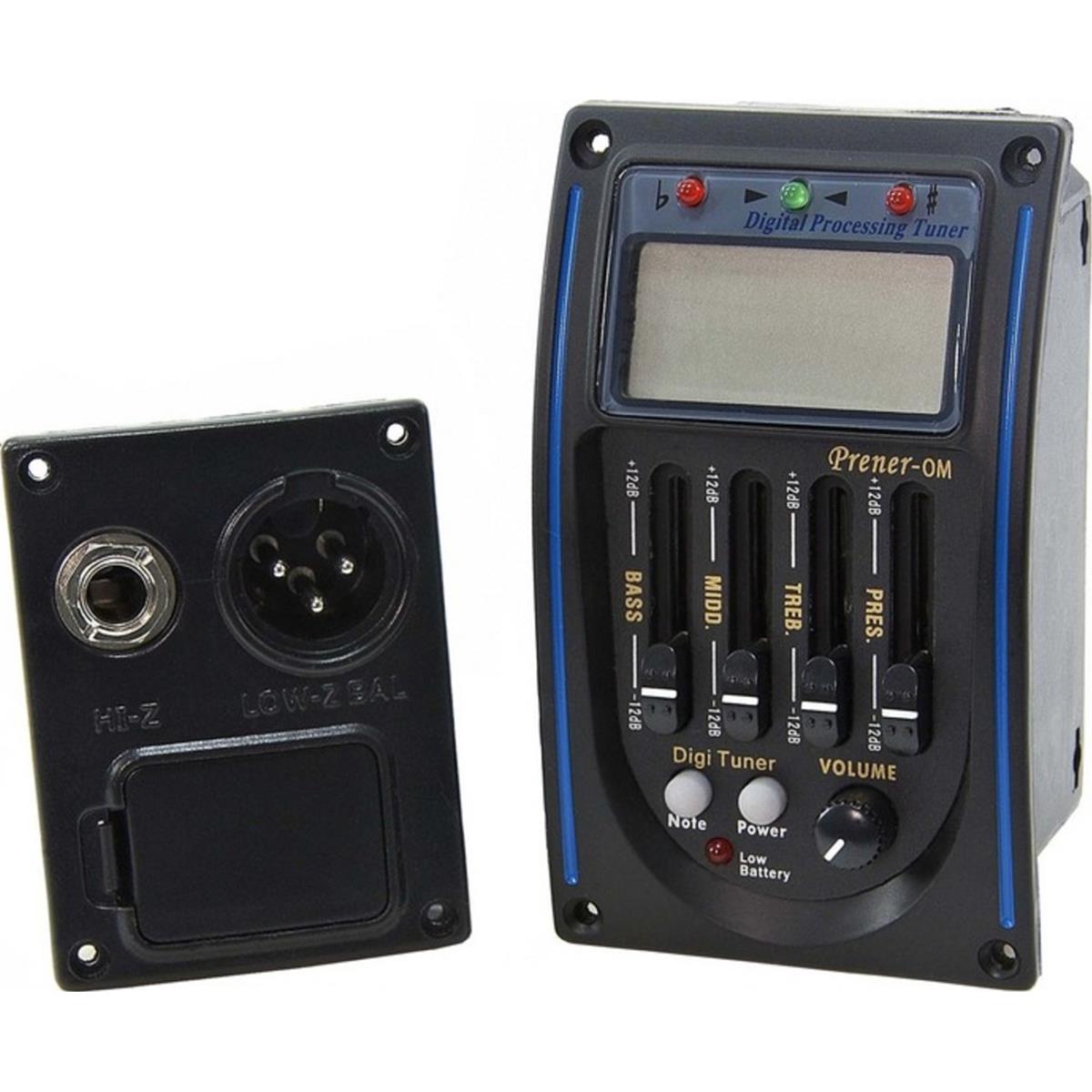 Pastilla para guitarra acústica, EQ de 4 bandas: bajos, medios, agudos y presencia, afinador LCD con modo automático y cromático, impedancia de entrada: 2.2 mili-ohms, respuesta de frecuencia: 20 Hz – 200 kHz, funciona con pila de 9V, pastilla Omega II piezo cable, caja de batería XLR combo, dimensiones: 58 x 98 mm.