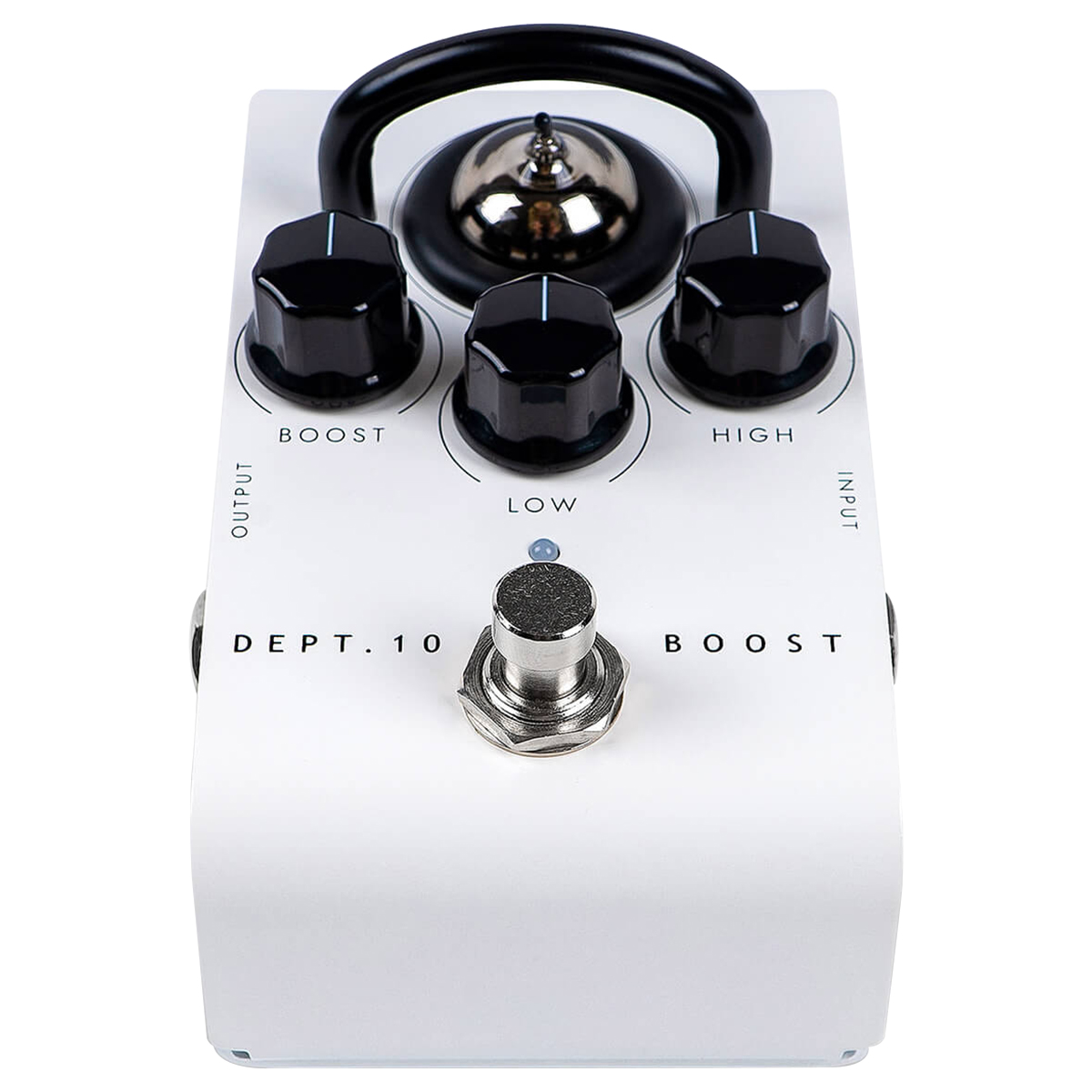 Pedal de efectos Boost, un canal, bulbo ECC83 triode, una voz, Ecualizador: Low/High “estilo James-Baxandall”, energía: 9V DC.