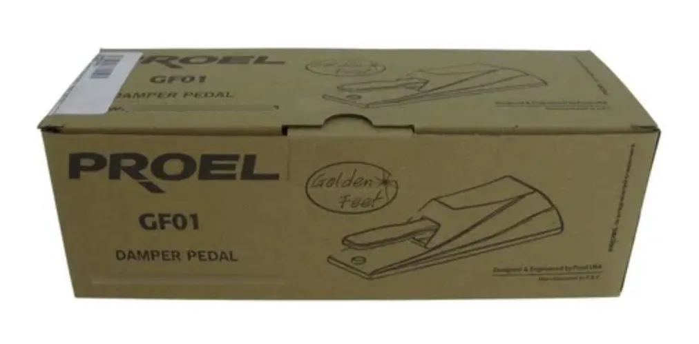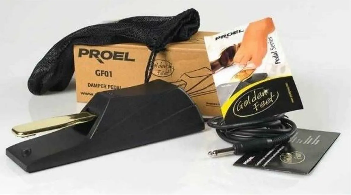 Pedal Proel de sustain para teclado mod GF01. Profesional con pie de oro. PedalDamper. Acabado en oro. Palanca y estructura de alta durabilidad. Encaja perfectamente con teclados, sintetizadores y pianos digitales. Cuenta la polaridad seleccionable y está equipado con un cable de 2 metros terminado con jack mono estándar macho chapado en oro. Ancho: 230 mm. Alto: 60 mm. Profundo: 70 mm. Peso: 0.77 Kg.