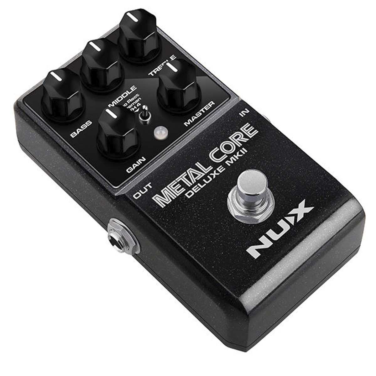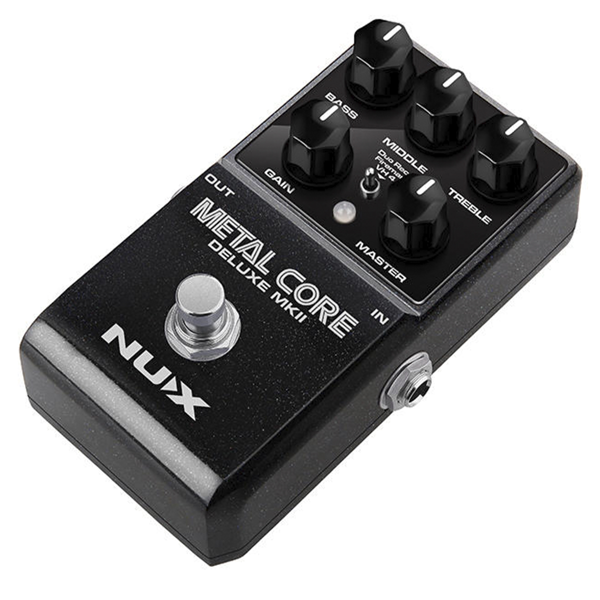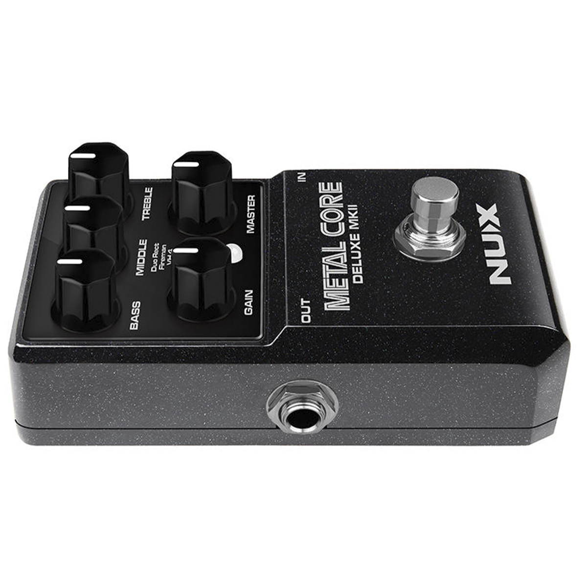 Pedal Nux Metal Core Deluxe MKII El NUX METAL CORE DELUXE MKII es un pedal de preamplificador de alta ganancia con 3 modelos distintivos de amplificador de alta ganancia, incluidos Duo Rect, Fireman y VH 4. Puede seleccionar estos modelos mediante el interruptor de palanca de 3 vías. 3 modelos de amplificador de alta ganancia en un gabinete compacto. Duo Rect: Basado en el rectificador dual Mesa Boogie. Salida de infrarrojos para aplicaciones sin amplificador. (resolución de 512 muestras) Guardado automático de parámetros en 3 modelos. Bajo consumo de energía. (menos de 120 mA)