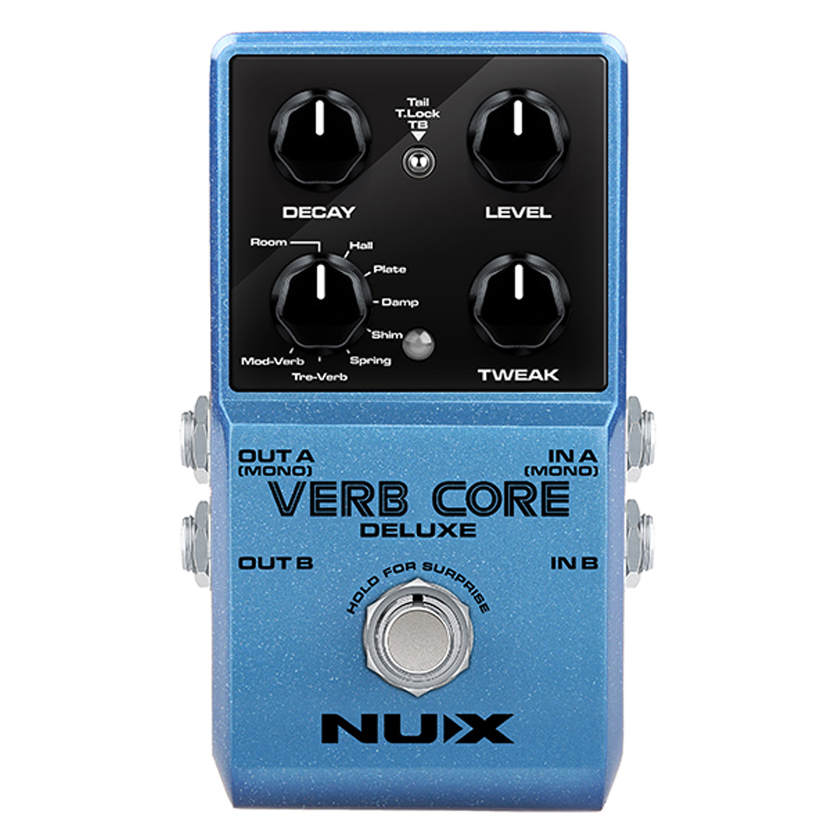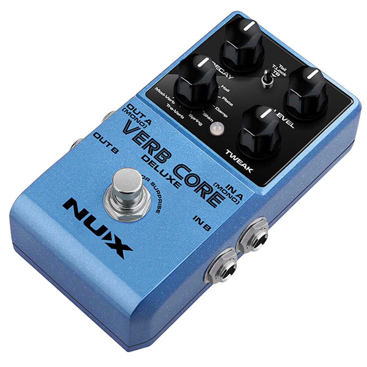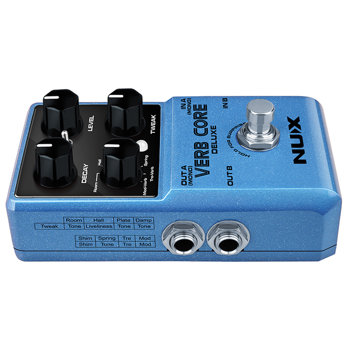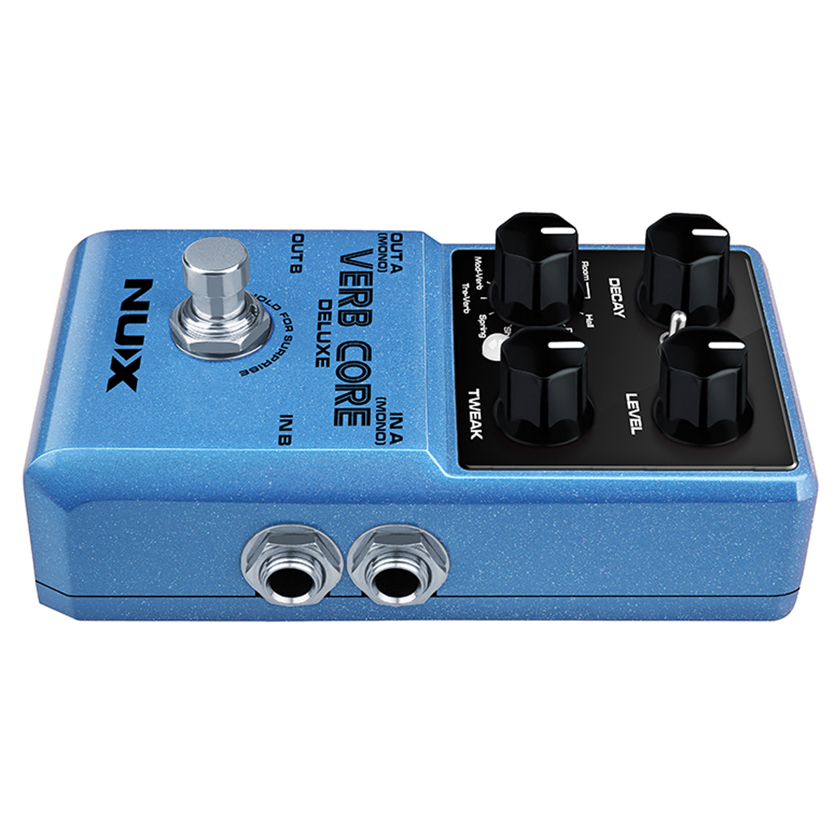 El NUX VERB CORE DELUXE es un pedal de reverberación con 8 tipos diferentes, incluidos Room, Hall, Plate, Damp, Shim, Spring, Tre-Verb y Mod Verb. Puede seleccionar el tipo de reverberación utilizando el mando Type. Interfaz de usuario intuitiva con perilla de decadencia, ajusta la duración del tiempo de reverberación. Perilla de nivel que ajusta el nivel de mezcla húmeda/seca de la reverberación, desde 0% hasta 100% cuando gira la perilla en el sentido de las agujas del reloj. Perilla de tipo de reverberación, perilla de ajuste, interruptor de palanca, pedal e indicador FS. Conectores de E/S. DC Jack, Puerto USB-C, conectores estándar de 1/4″ (mono/TS)
