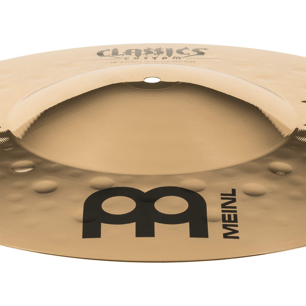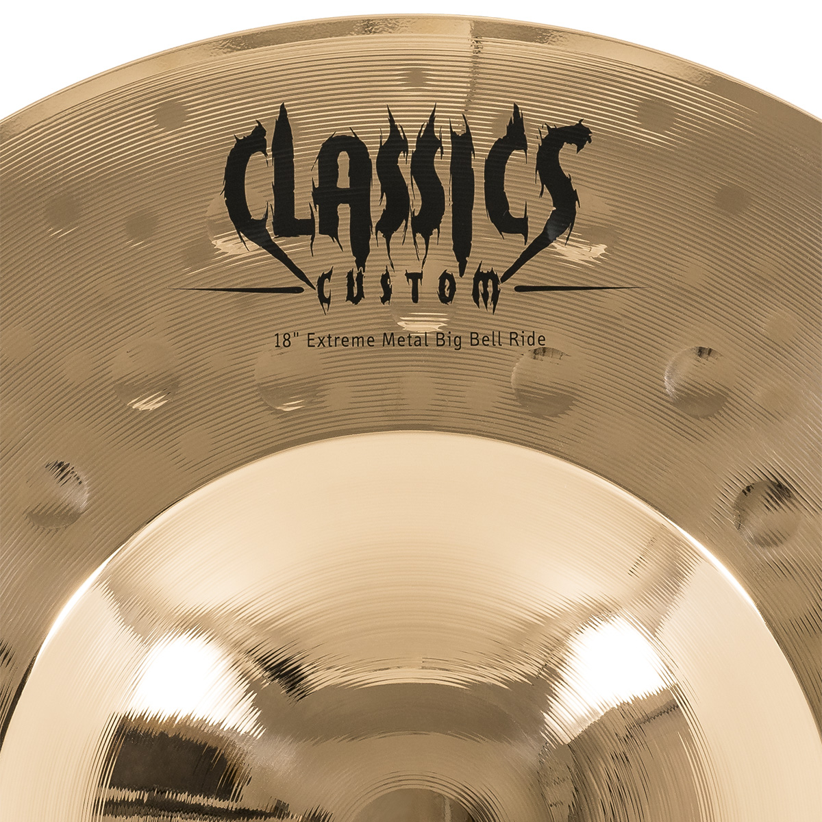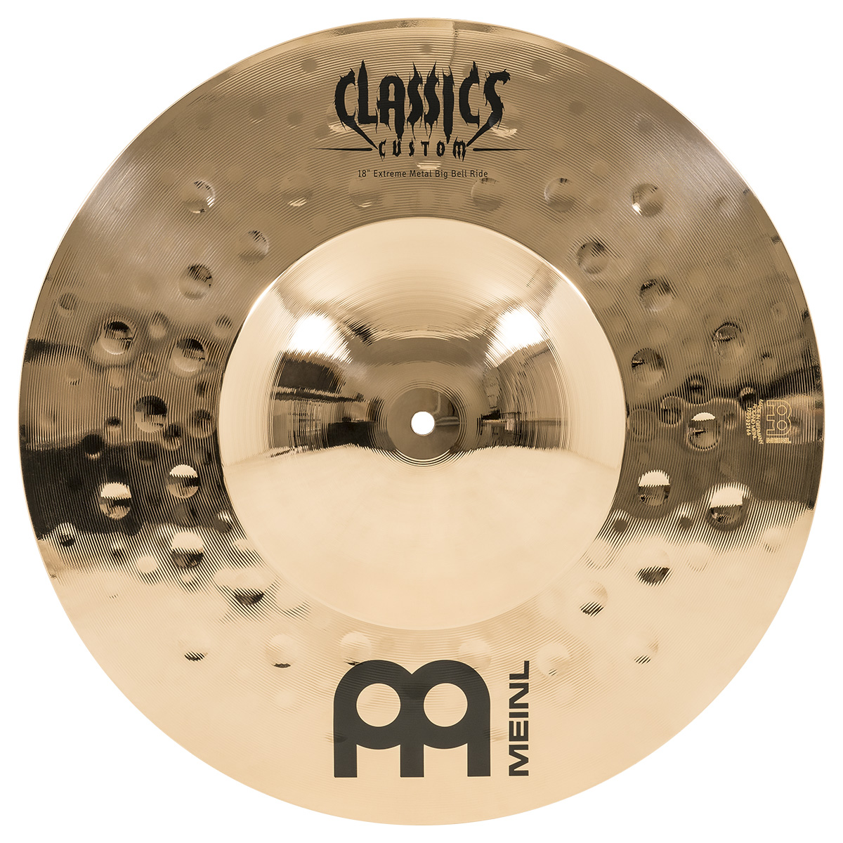 Ride de 18″ pulgadas, serie Classics Custom, modelo Extreme Metal Big Bell Ride, campana grande y definida, timbre brillante, carácter explosivo y cortante, tono agudo, volumen alto, sustain largo, terminado brillante, fabricado con aleación de bronce B12.