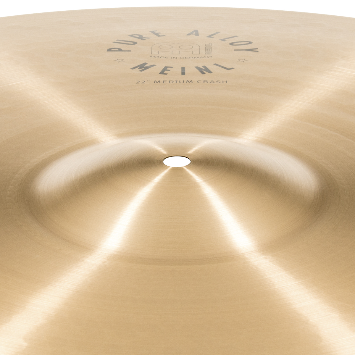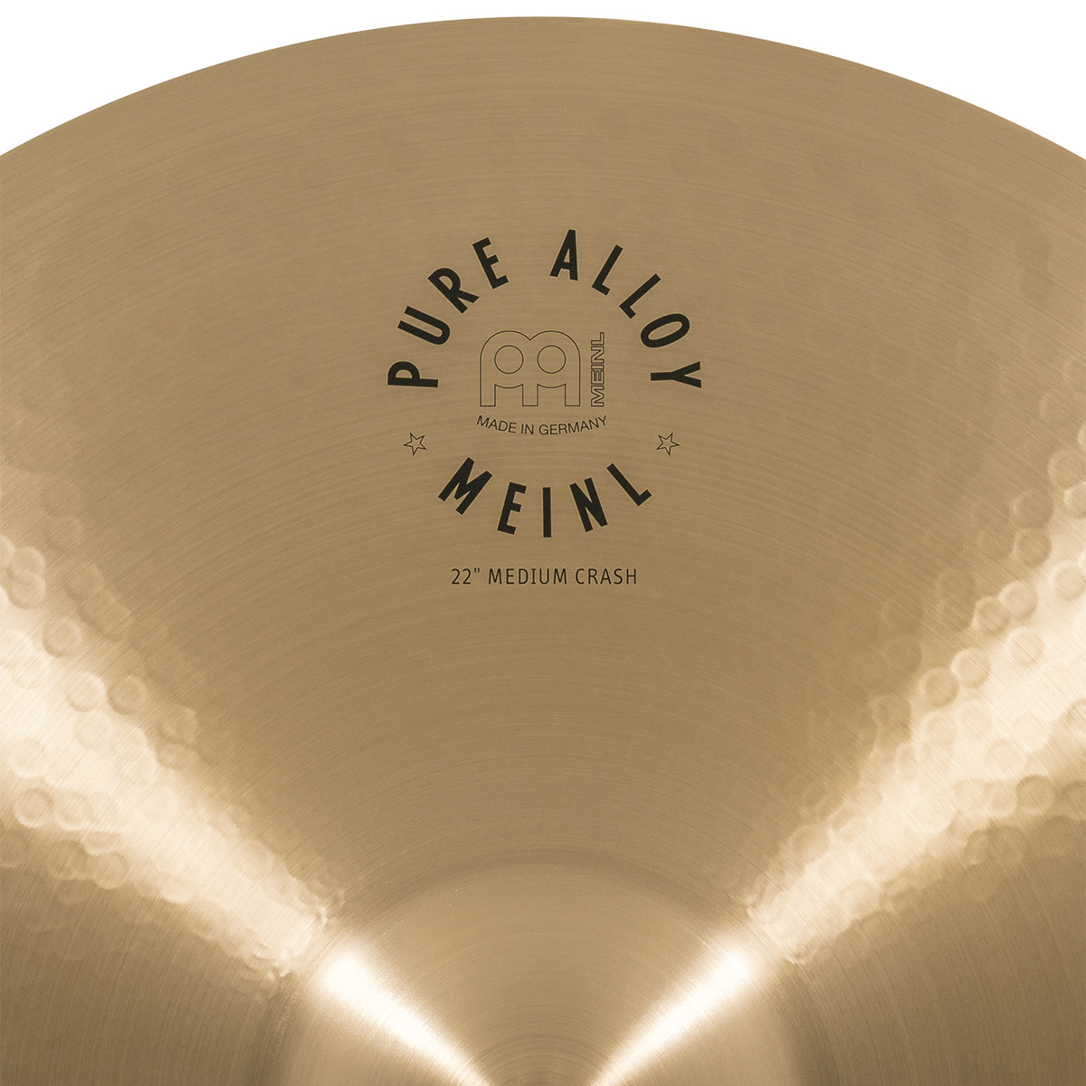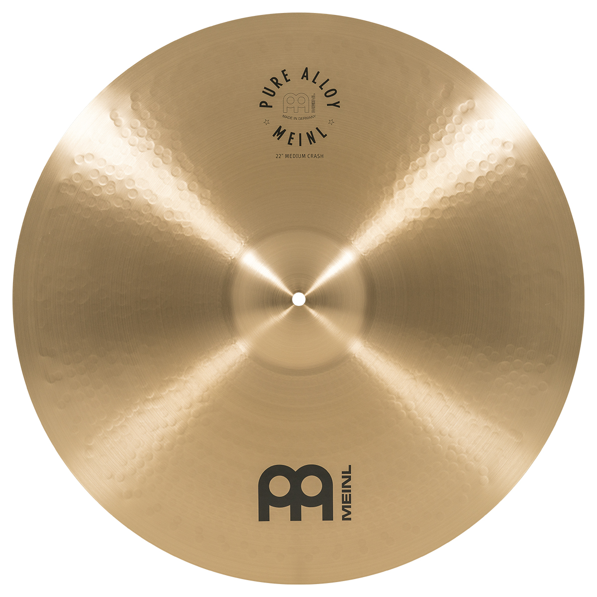 Platillo medium crash de 22″ pulgadas, modelo Pure Alloy, sonido limpio, superficie completamente torneada, expresivo, timbre medio-oscuro, carácter claridad brillante, tono agudo-medio, volumen medio a bajo, sustain medio, terminado tradicional, fabricado con aleación especial de meinl Pure Alloy.