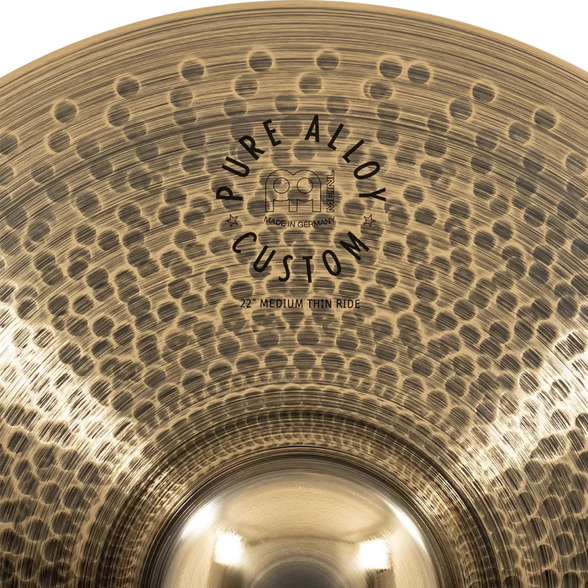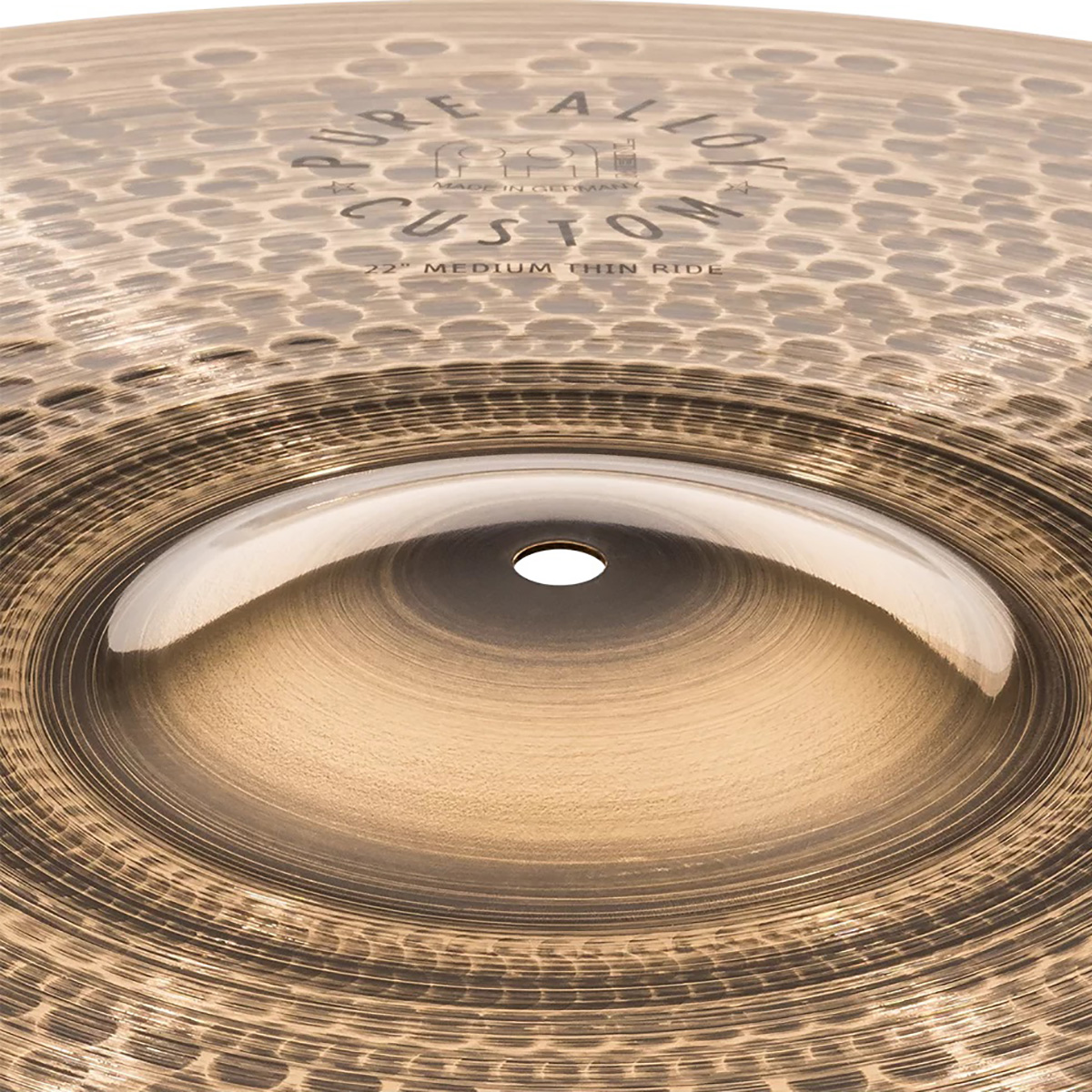 Platillo medium thin-ride de 22″ pulgadas, serie Pure Alloy Custom, amplio rango dinámico, campana cortante, martillado para darle forma, fabricado en Alemania, parte superior de bronce ahumado personalizado, parte inferior brillante, campana cortante, buen equilibrio y ataque de baqueta, espectro tonal más completo, peso medio delgado.