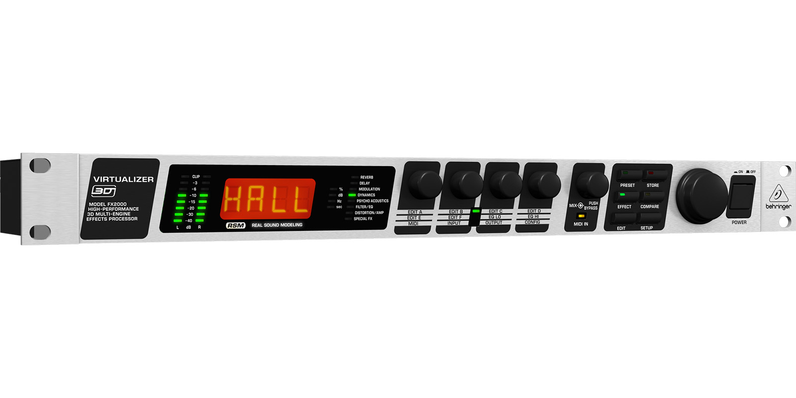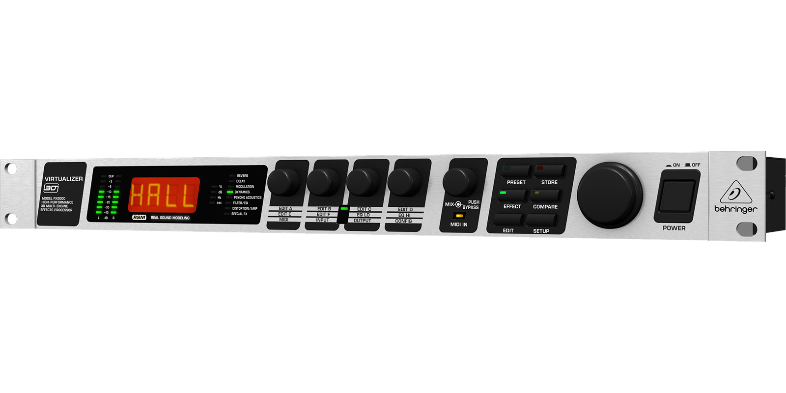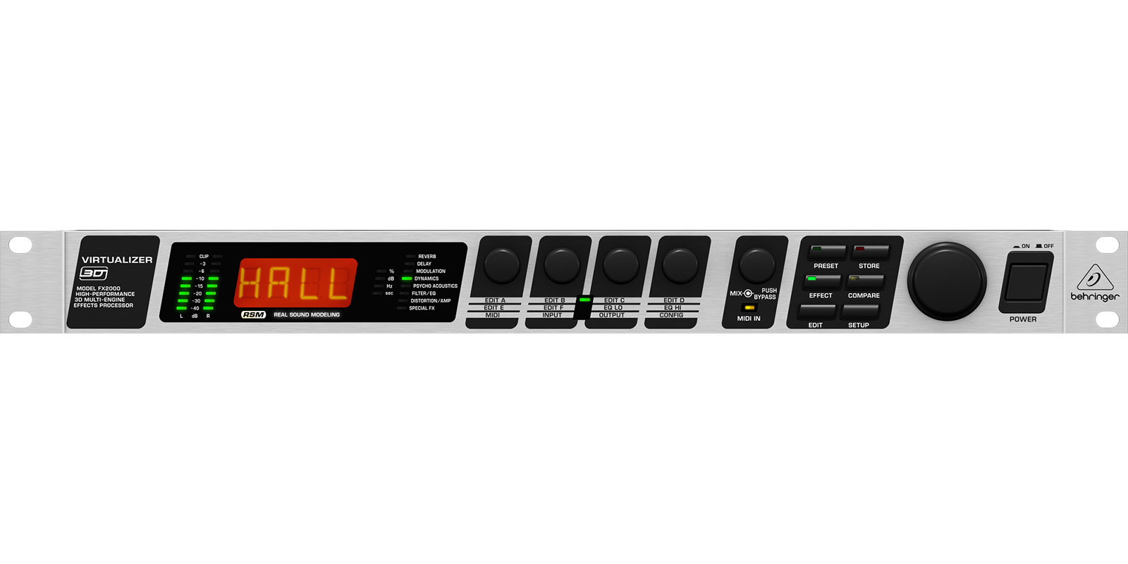 Procesador de efectos multimotor 3D de alto rendimiento, 71 sorprendentes y nuevos algoritmos RSM true (Modelado Real de Sonido) estéreo y efectos 3D, algoritmos de reverberación de salas virtuales adaptables a ondas para el reverb natural y delay, increíbles algoritmos de modulación, dinámica, psicoacústica y EQ, simulación auténtica de amplificadores, distorsión y efectos especiales, 11 combinaciones de efectos con configuración serial/paralelo seleccionable, hasta 7 parámetros ajustables más EQ de 2 bandas por efecto, convertidores A/D y D/A de 24 bits con sobremuestreo de 64/128 veces, procesamiento estéreo real para una separación realista de canales en imagen estéreo, 100 preajustes de fábrica además de 100 ubicaciones de memoria de usuario, amplia implementación MIDI, medidores de nivel LED precisos para un ajuste perfecto del nivel y un rendimiento óptimo, entradas y salidas XLR y TRS 1/4″ servo balanceadas, dimensiones: 44 x 482.6 x 204.4 mm, peso: 2 kg.