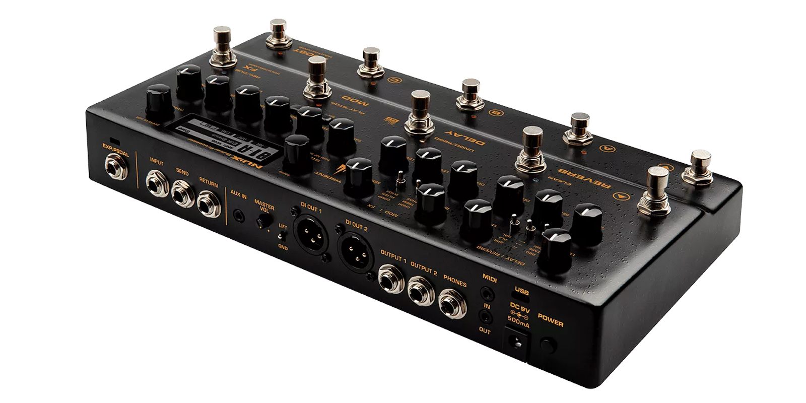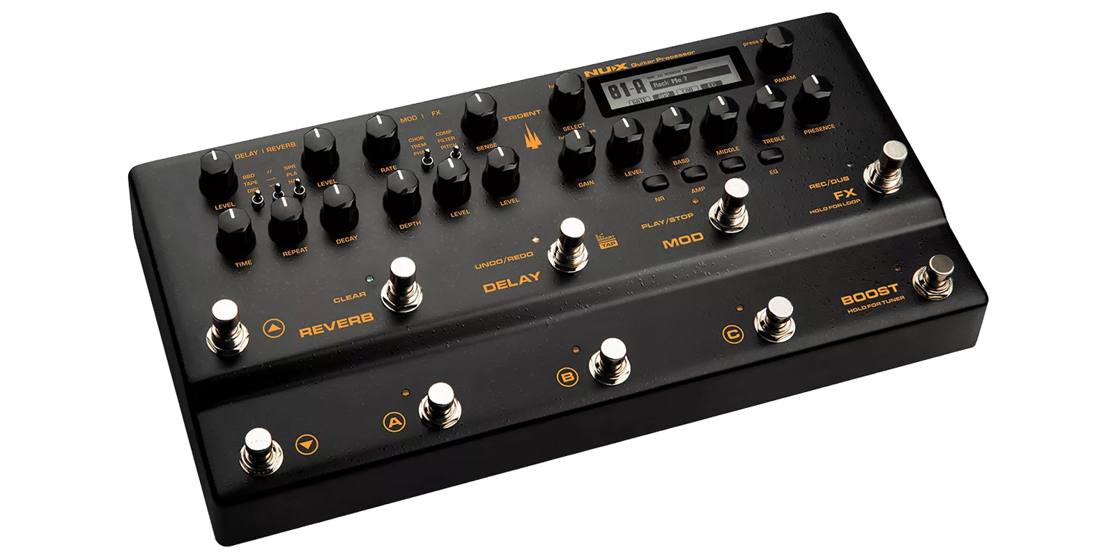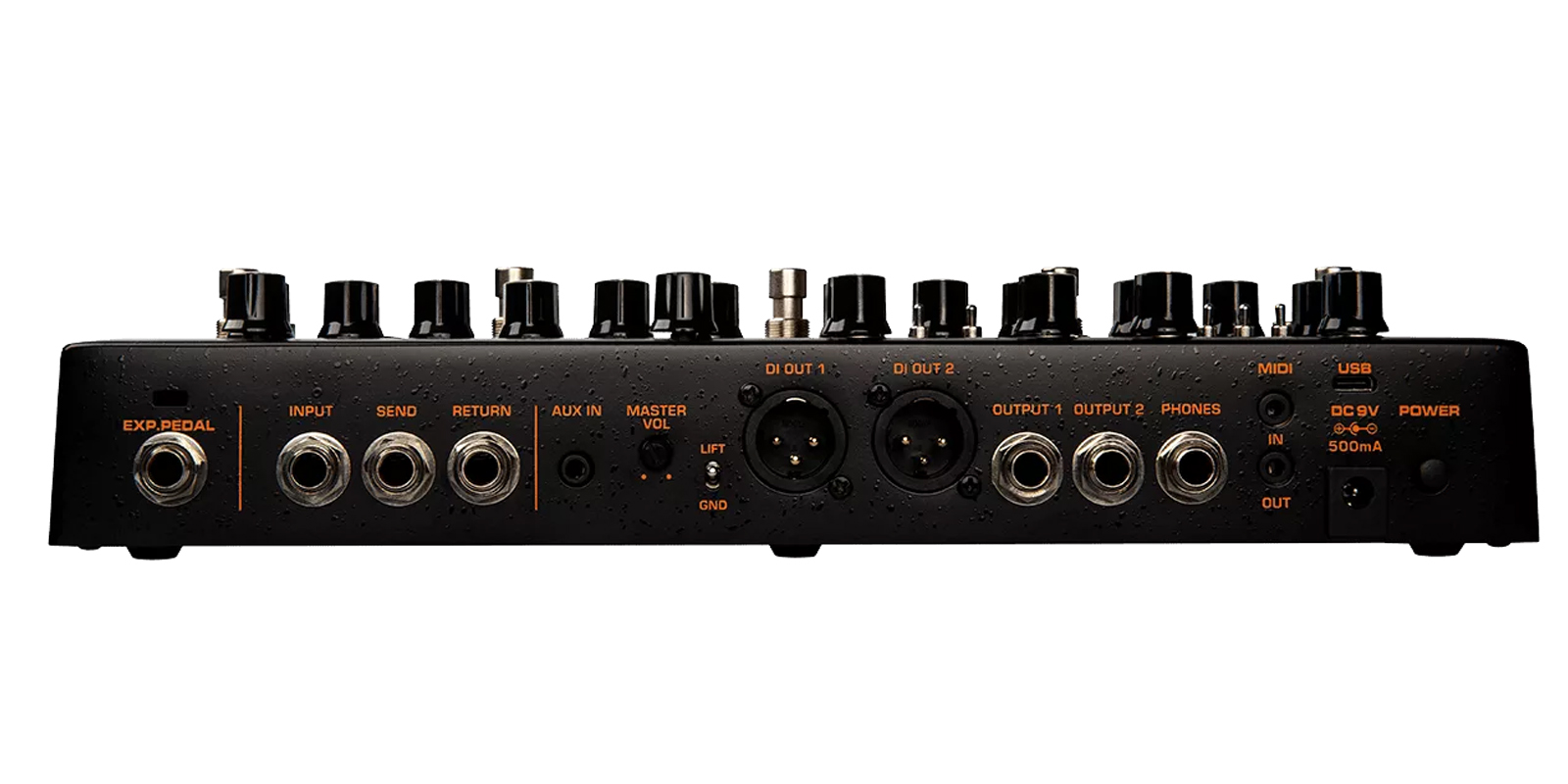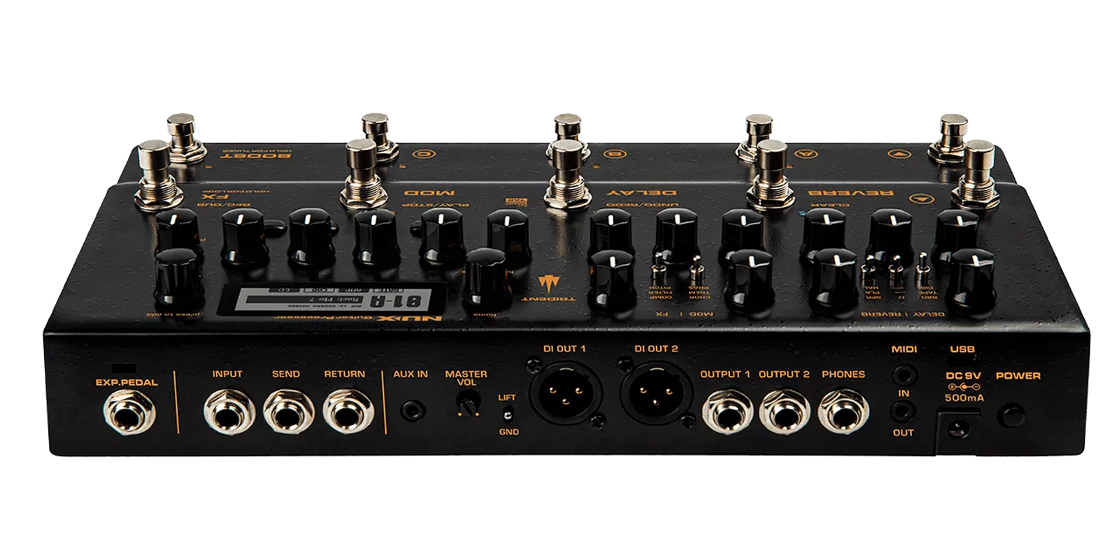 Perfecto para aplicaciones en vivo, TRIDENT ofrece muchas opciones de E/S. El bucle de efectos SEND/RETURN para efectos externos, 2 salidas XLR balanceadas para el sistema PA, salida PHONES para monitoreo, EXP. Entrada PEDAL para agregar un pedal de expresión, potenciómetro MASTER VOL y MIDI IN/OUT