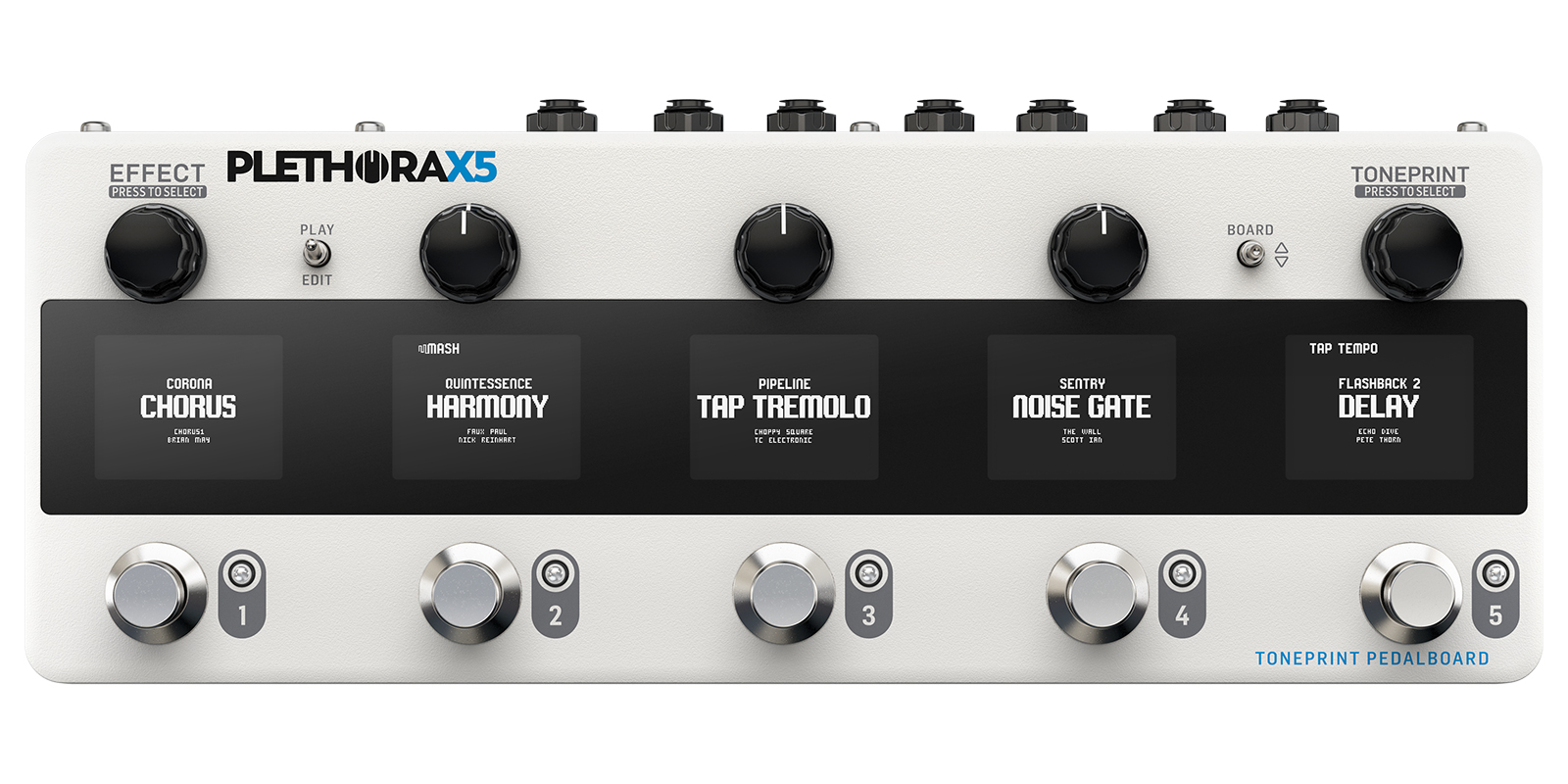 Tan pronto como desempaques Plethora, tendrás un montón de sabrosos pedales prefabricados listos para usar. Sin problemas. Si tienes una idea específica sobre lo que necesitas, ve un paso más allá y elije qué pedales irán a cada parte de tu pedalera. O puedes ir más adentro y ensuciarte las manos con nuestra patentada tecnología TonePrint que te permite personalizar cada pedal en profundidad para una configuración verdaderamente única. Tú decides hasta dónde quieres llegar. Configurar una bonita pedalera lleva su tiempo. Planifica, mide y descubre el consumo de corriente combinando y corta el velcro, todo antes de organizar cables y cables de alimentación de una manera que no se parezca a las consecuencias de un evento apocalíptico menor. Confía en nosotros, hemos construido muchas pedaleras. Bueno, no tiene que ser tan difícil. Plethora X5 hace que toda la experiencia de construcción de tablas sea mucho más intuitiva y divertida. Con la capacidad de crear y almacenar hasta 127 tableros personalizados, adaptados a tus necesidades, nunca te quedarás sin tonos. Rellena cada una de las tablas con cualquier combinación de pedal TonePrint. Plethora X5 te permite combinar hasta 5 pedales TonePrint de tu elección y organizarlos en el orden que necesites en cada uno de los tableros. Esta es tu oportunidad de hacer el pedal delay/reverb combinado que estabas ansiosamente esperando, con un lado adicional de modulación y cambio de tono para un tono realmente masivo. Son todos tus stomps TC favoritos en una unidad que satisfará todas tus necesidades de seguimiento de tono, compresión de grado de estudio, modulación sensual, activación discreta de ruido, reverberación de tono, épico delay y mucho más. Incluso podríamos agregar más pedales en el futuro si nos preguntas amablemente. Cada pedal en Plethora X5 tiene 75 ranuras TonePrint disponibles para recuperar rápidamente tus configuraciones favoritas, permitiéndote cotejas y almacenar una lista de tus sonidos favoritos para mantenerlos seguros. Marca y almacena una gran variedad de TonePrints únicos, hechos a medida para tu configuración de equipo personal y ten una gran cantidad de tonos icónicos listos para tu próxima sesión de improvisación hecha por los mejores músicos del mundo.