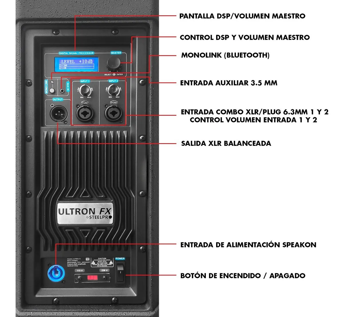 El Professional Active Speaker System Steelpro Mod. ULTRON-FX es una solución de audio integral diseñada para aplicaciones de alto rendimiento. Equipado con amplificación de última generación, el modelo ULTRON-FX integra un procesador digital de señales (DSP) que permite optimizar la respuesta acústica según el entorno de uso. Su arquitectura interna asegura una dispersión sonora uniforme y una distorsión mínima incluso a volúmenes elevados. Con múltiples opciones de entrada y un diseño de chasis ergonómico y resistente, el Ultron-FX es la herramienta definitiva para DJs, bandas y sonorización de eventos que requieren un bafle confiable y potente.