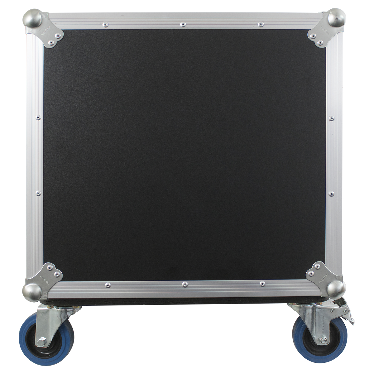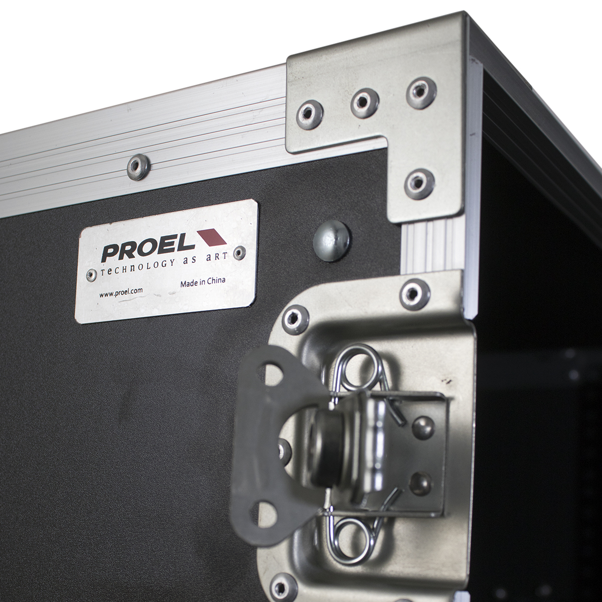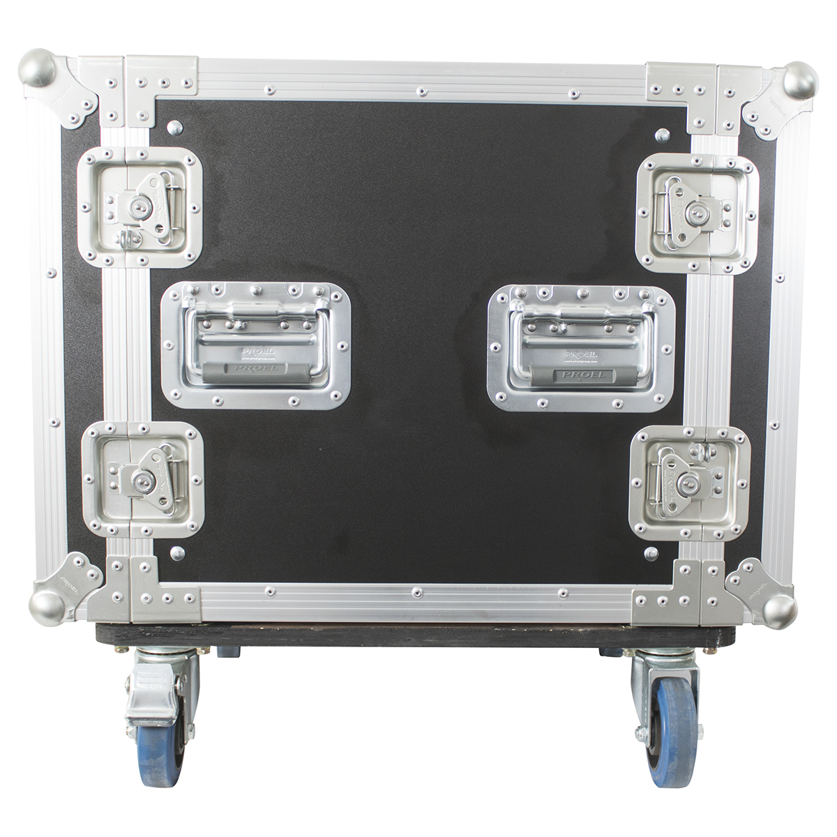 Rack estándar de 19″ pulgadas con ruedas azules tipo industrial de 100 mm (dos con freno), hecho de contrachapado marino de 5 capas con enlace fenólico de 9 mm de espesor. Revestimiento laminado negro resistente a los arañazos y al agua con interior pintado en color negro. Provisto de pequeños cierres de mariposa de acero galvanizado, asas empotradas accionadas por resort con empuñadura de goma, esquina de bola de acero y abrazadera de 6 agujeros, perfil profesional de aluminio y patas de goma de grado industrial. Se incluyen rieles de rack estándar en la parte delantera y trasera y una cantidad de tornillos de riel de instalación, rondanas y tuercas. Profundidad apilable: 45 cm. Barras laterales reforzadas de acero galvanizado. Tapas delantera y trasera con espuma y correas de velcro montadas para manejo de cables y accesorios.
