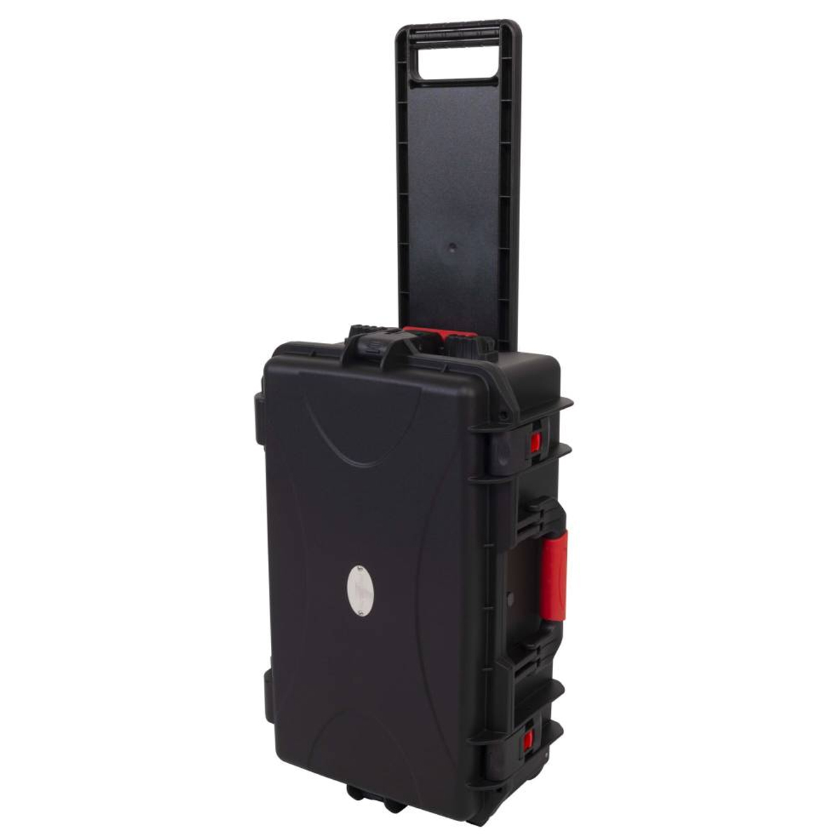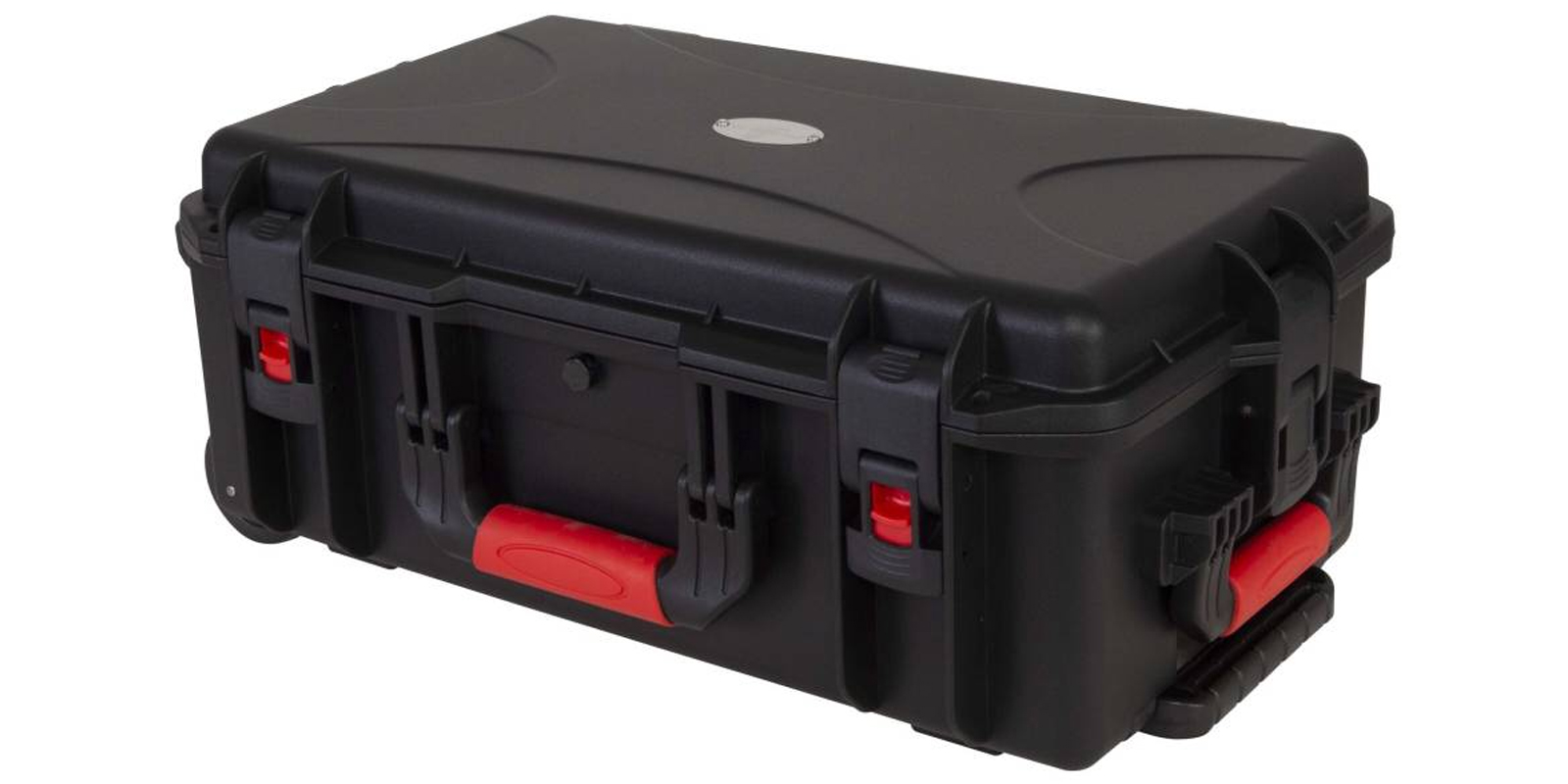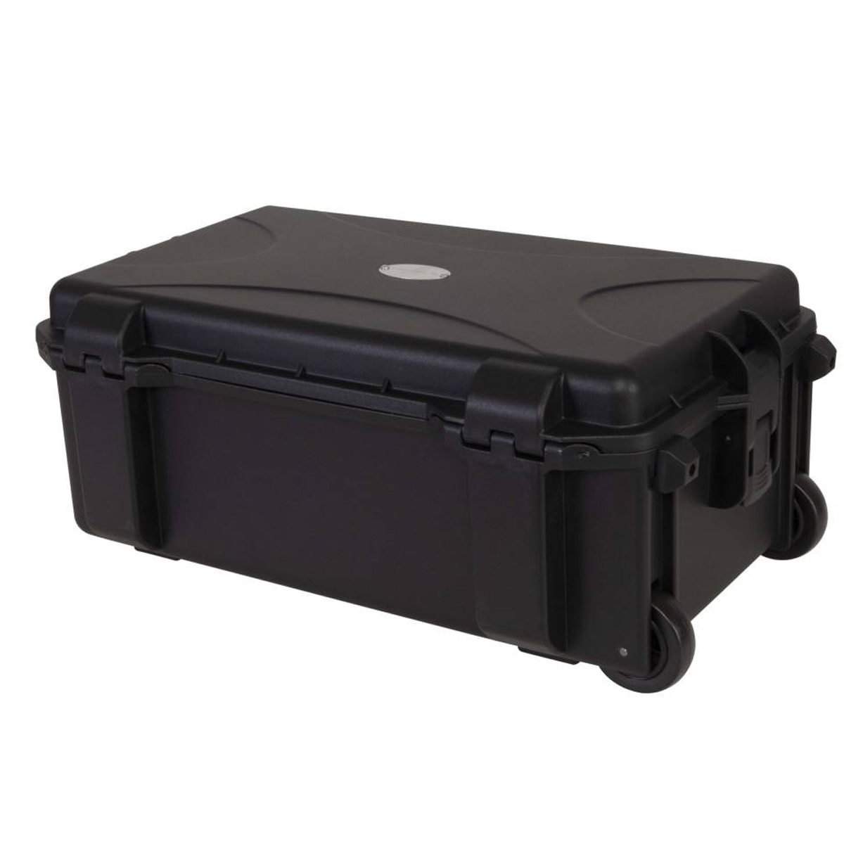 Estuche de polipropileno moldeado por inyección Equipado con una práctica asa plegable, con sistema de bloqueo y ruedas empotradas en la estructura. Dimensiones externas: Anchura 580 mm x Profundidad 345 mm x Altura 230 mm / Dimensiones internas: Anchura 520 mm x Profundidad 288 mm x Altura 200 (150 + 50) mm. Color negro.