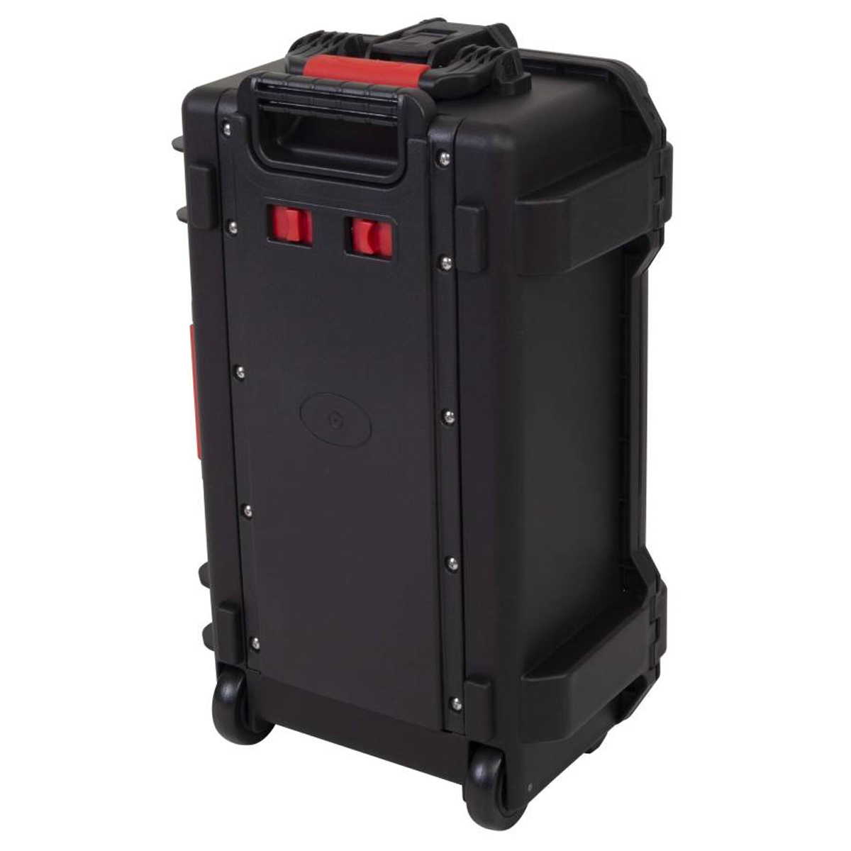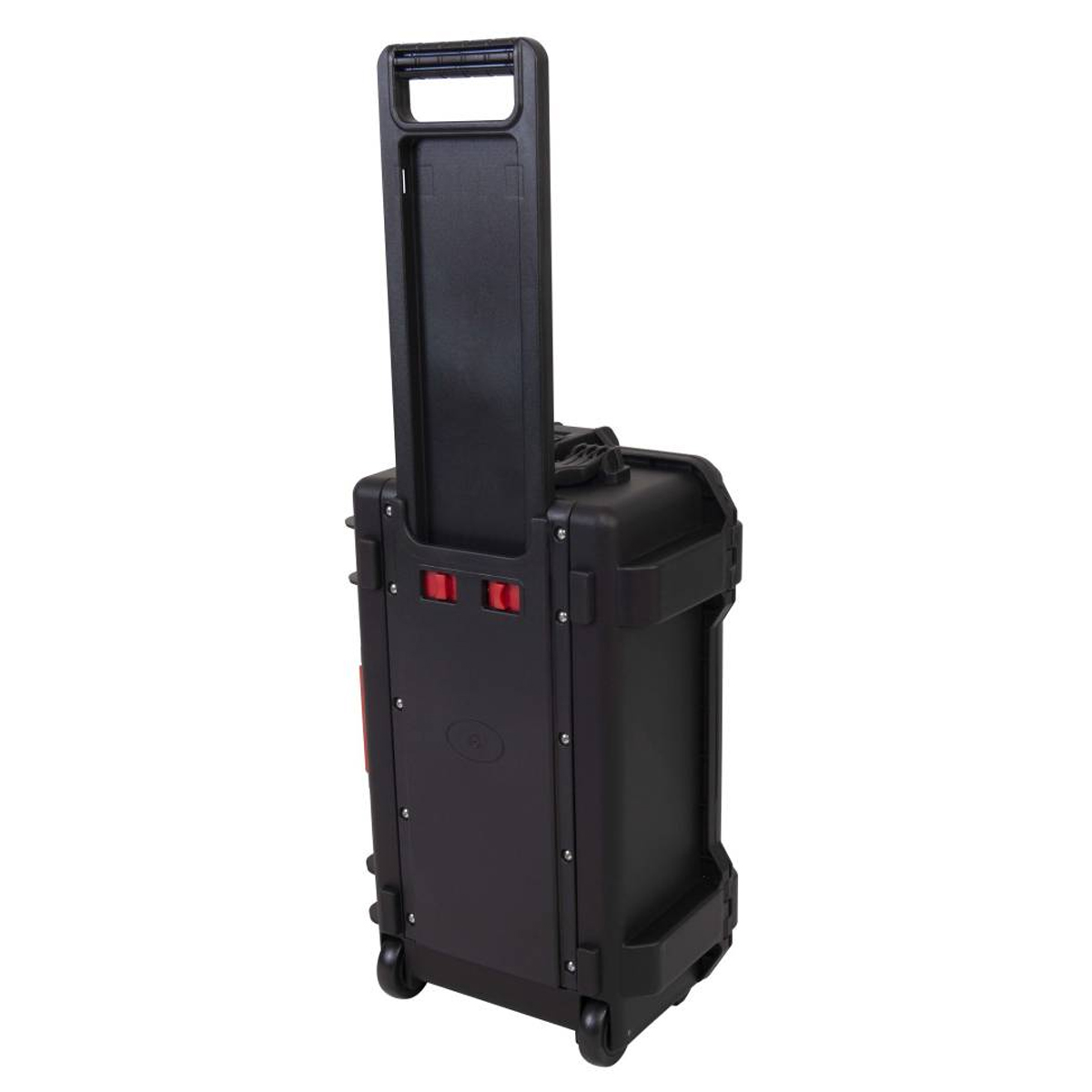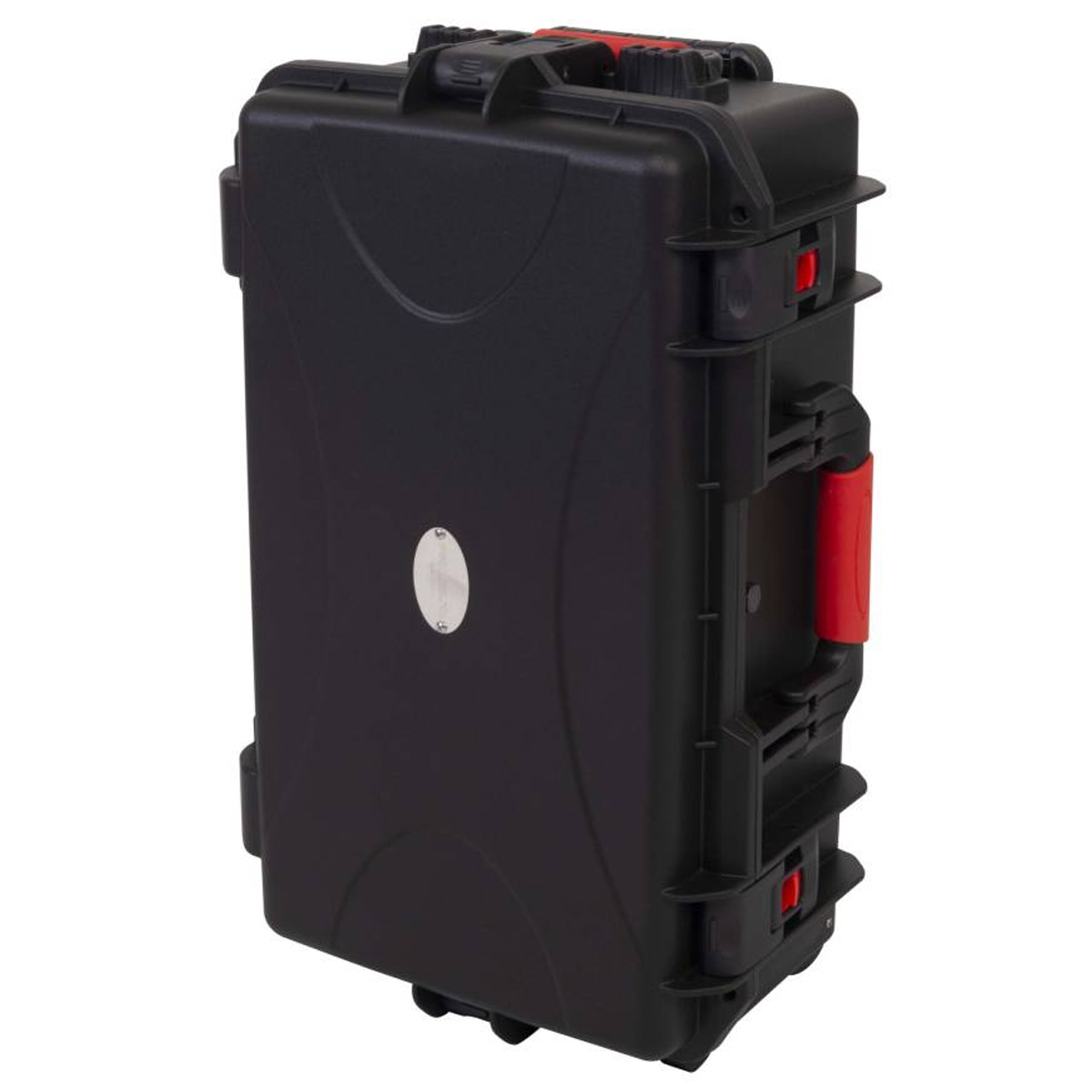 Estuche de polipropileno moldeado por inyección Equipado con una práctica asa plegable, con sistema de bloqueo y ruedas empotradas en la estructura. Dimensiones externas: Anchura 580 mm x Profundidad 345 mm x Altura 230 mm / Dimensiones internas: Anchura 520 mm x Profundidad 288 mm x Altura 200 (150 + 50) mm. Color negro.