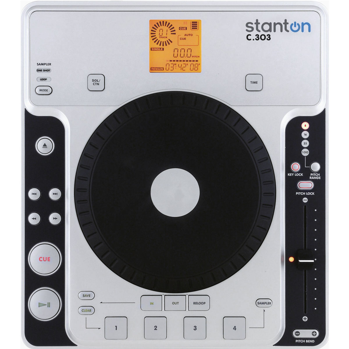 Reproductor Stanton sencillo para CD. Modelo: C.303. Reproductor de CD de mesa.Rueda de desplazamiento de súper tamaño. Pitch ajustable con key lock y pitch bend. 4 botones de disparo de samples y cue memory. Reproducción anti-choque. Pitch a 4-8 y 16%. Control de canciones.