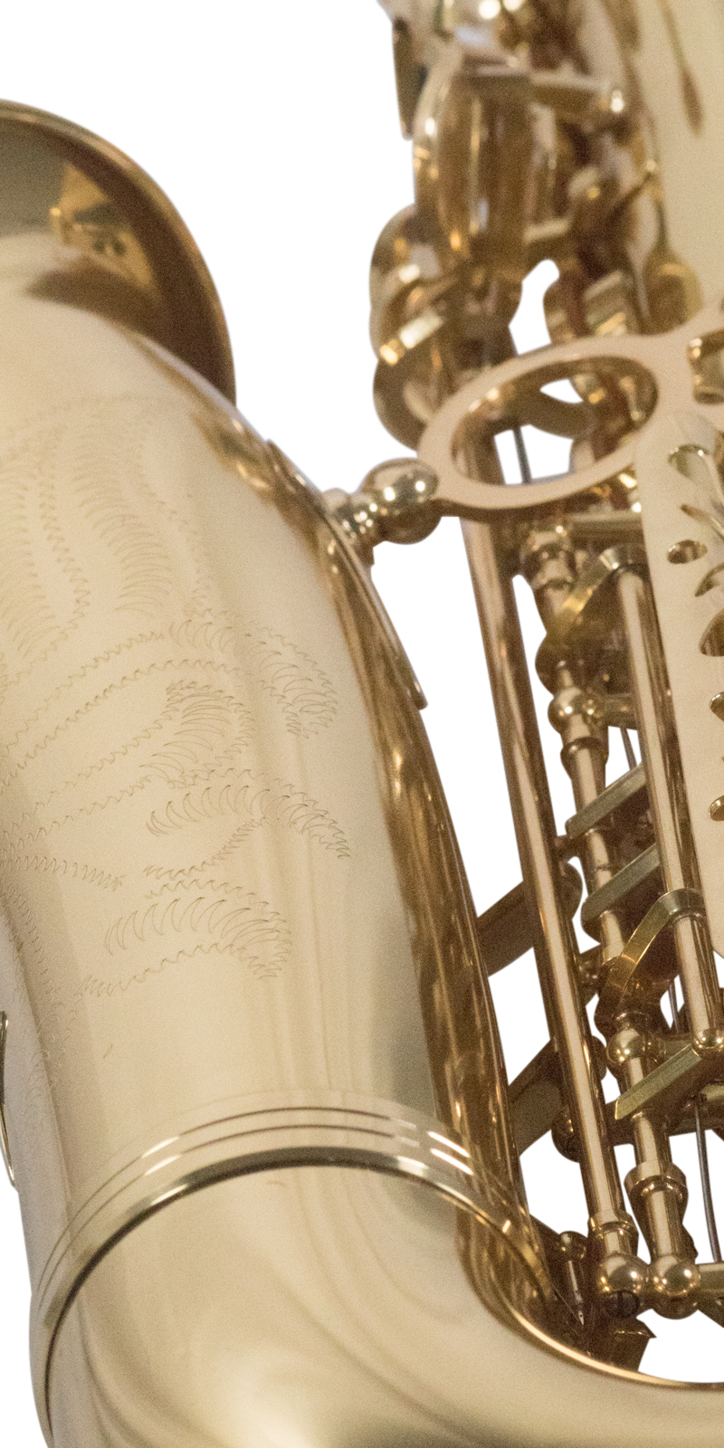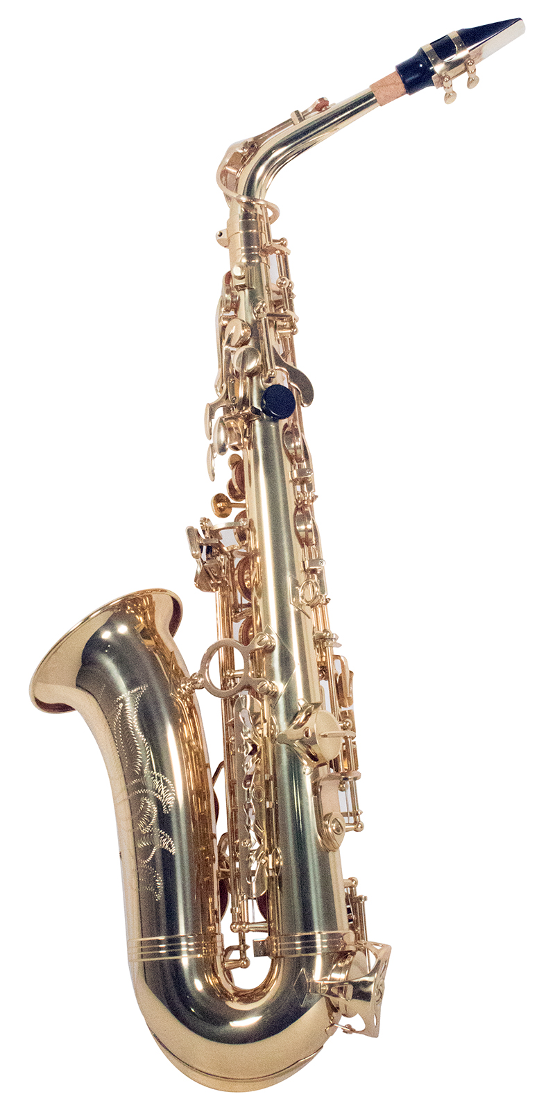 Saxofón alto, tonalidad Eb, llave de F#, laqueado dorado, incluye estuche ligero.