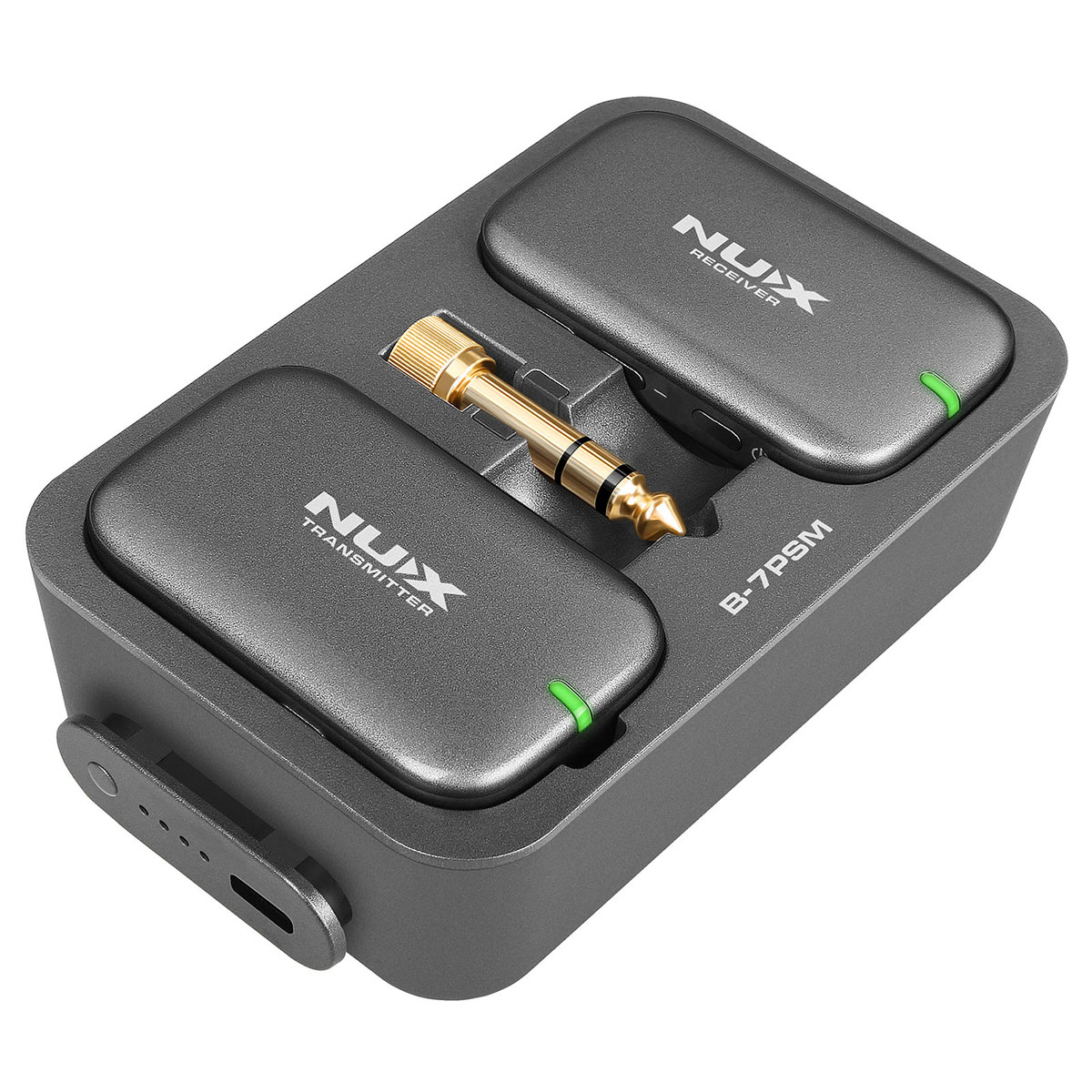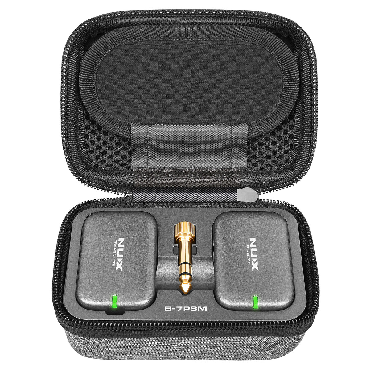 B-7PSM de NUX es un sistema de monitoreo personal in-ear con exploración automática del entorno de RF, frecuencia de transmisión libre de interferencias de 5.8 GHz y transmisión de audio estéreo de alta calidad de 24 bits / 40 kHz. Desde cualquier posición. En cualquier escenario. Escucha cada nota en detalle con este sistema de monitoreo in-ear. Encuentra rápidamente un canal inalámbrico limpio y lo asigna automáticamente. El B-7PSM ofrece una latencia súper baja de menos ee 5.5 ms y tiene un rango de operación de 27 metros cuando no hay obstrucciones entre el receptor (RX) y el transmisor (TX). El rango de operación es de aproximadamente 9 metros cuando hay alguna obstrucción. Es un sistema mini compacto inalámbrico súper ligero diseñado para usarse al instante. El TX cuenta con un conector TRS de 1/8″ (puedes usar el adaptador incluido para convertirlo a 1/4″), audio de calidad broadcasting a través de una transmisión digital de 5.8 GHz al RX compacto. El diseño de clip del RX puede ajustarse fácilmente a tu camisa, cinturón o tahalí de guitarra. Y con nuestra nueva tecnología automática de salto de frecuencia, el B-7PSM es confiable y estable mientras estás en el escenario. Al desacoplar varios sistemas B-7PSM, enciende un set primero, emparéjalo y luego enciende los otros sets secuencialmente. Para obtener los mejores resultados, el TX debe estar al menos a 1 metro del suelo, a 2 metros de los enrutadores Wi-Fi y las paredes o superficies metálicas para minimizar las reflexiones. El sencillo sistema de emparejamiento lo hace muy fácil de usar, solo enciende ambas unidades inalámbricas /TX y RX), luego se emparejarán en un par de segundos. Cada set inalámbrico tiene un algoritmo de emparejamiento único, se detecta automáticamente entre sí y configura sus propias IDs. La señal nunca interfiere con ninguna otra conexión inalámbrica, incluida la señal WiFi. Se recomienda mantenerse a 2 metros de distancia del enrutador WiFi para obtener mejores resultados. Conecta el TX a una mezcladora en vivo o personal y enciende el TX (el indicador LED se mostrará en verde). Luego conecta tus audífonos internos con el RX, enciende el RX para emparejarlo con el TX. El indicador LED será verde continuo. Ahora está listo para funcionar. Precaución: No te coloques los in-ears en tus oídos antes de comenzar a ajustar el volumen, puedes dañar tus oídos si el volumen es demasiado alto. Puedes ajustar el volumen RX en incrementos de 0.5 dB con los botones + y -. El volumen máximo es 0 dB y el mínimo es -64 dB. Si mantienes presionado el botón + o -, puedes aumentar o disminuir el volumen rápidamente. El B-7PSM ofrece transmisión de audio estéreo, por lo que es perfecto para trabajar con mezcladoras personales profesionales para panoramizar los tracks como desees en el escenario o en el estudio durante los ensayos y presentaciones en vivo. El B-7PSM presenta una calidad de sonido superior con un rango dinámico de 92 dBa y una respuesta de frecuencia de 20 – 19 kHz. Nota: Presiona brevemente el botón de encendido del RX para volver a la configuración de volumen predeterminada. Puede ser demasiado alto si los in-ears son muy sensibles. Baja el volumen de la mezcladora y auméntalo con cuidado. Te recomendamos que uses in-ears o audífonos con una impedancia de 16-32 ohms para obtener la mejor experiencia. Puedes cargar las unidades RX y TX con el estuche de almacenamiento recargable o usando el cable USB-C para cargar. Ambas unidades pueden funcionar mientras se cargan por si acaso.