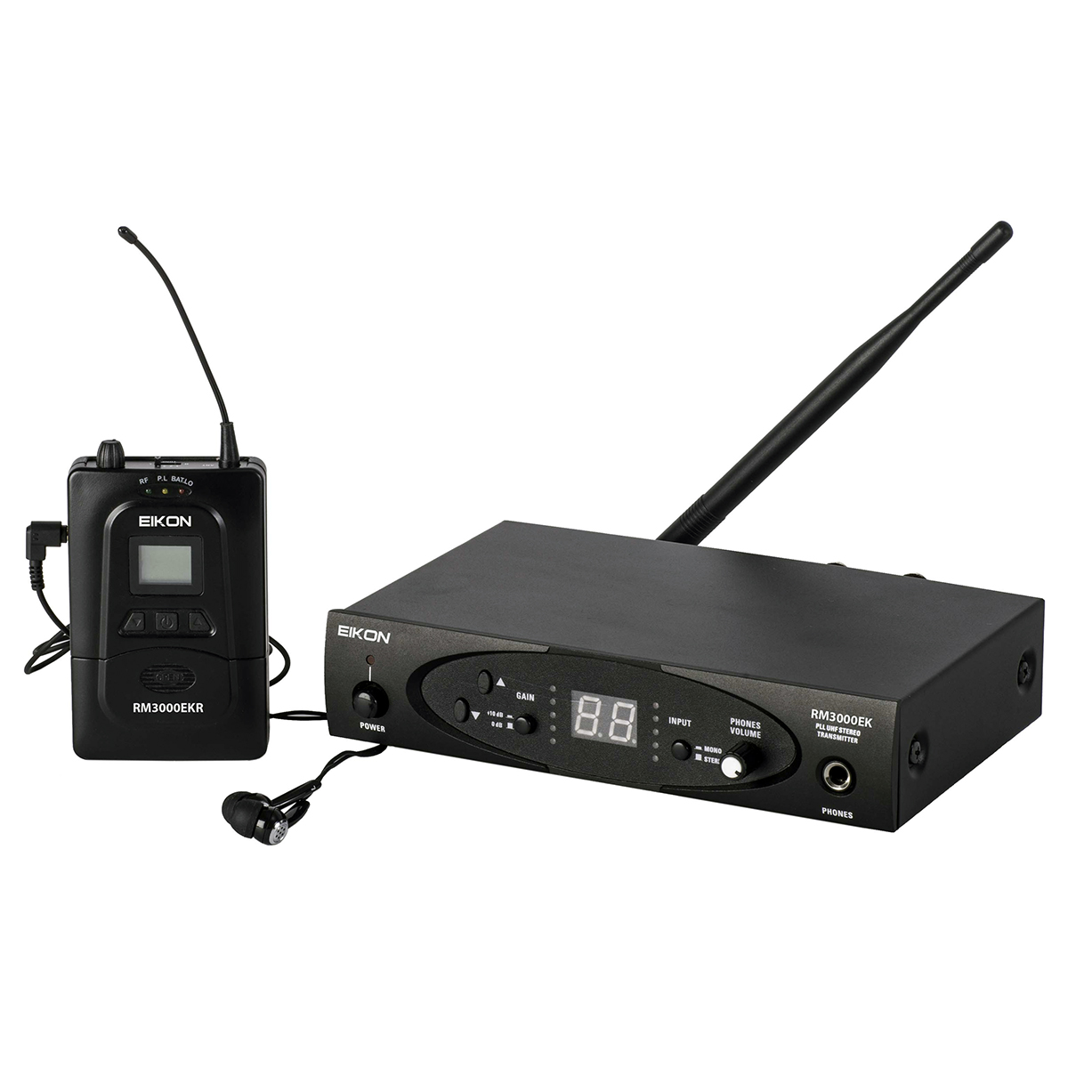 Sistema de monitoreo in-ear inalámbrico, controlado por UHF PLL, transmisión de señal confiable y de alta calidad, incluye un transmisor RM3000EK metálico que cuenta con 8 frecuencias seleccionables, indicadores de nivel de audio, selector de canales y pantalla, salida de audífonos, control de nivel de entrada de audio, entradas combo (XLR + JACK) y modo mono o estéreo seleccionables, un receptor de bolsillo RM3000EKR que cuenta con 8 frecuencias seleccionables, pantalla LCD más indicadores RF y AF, indicador de nivel de batería, salida de audífonos 2×100 mW @ 16 ohms, limitador y ecualizador seleccionables, modo mono o estéreo seleccionables, hasta 5 hotas de uso con 2 pilas AA de 1.5V y también unos audífonos EB10.