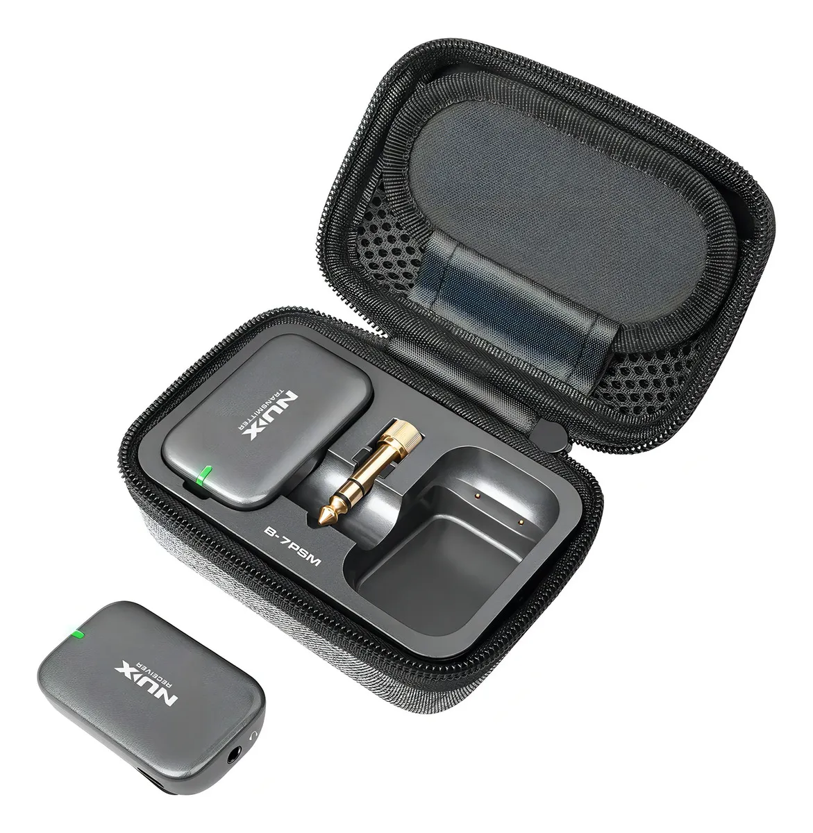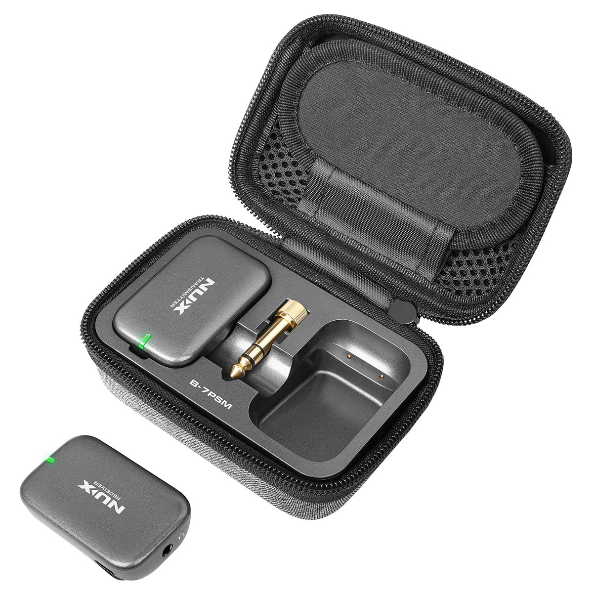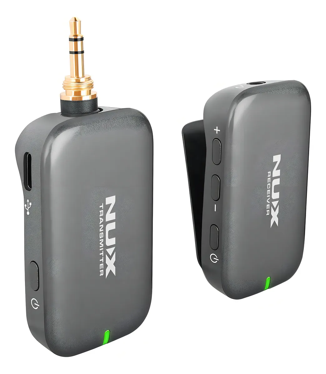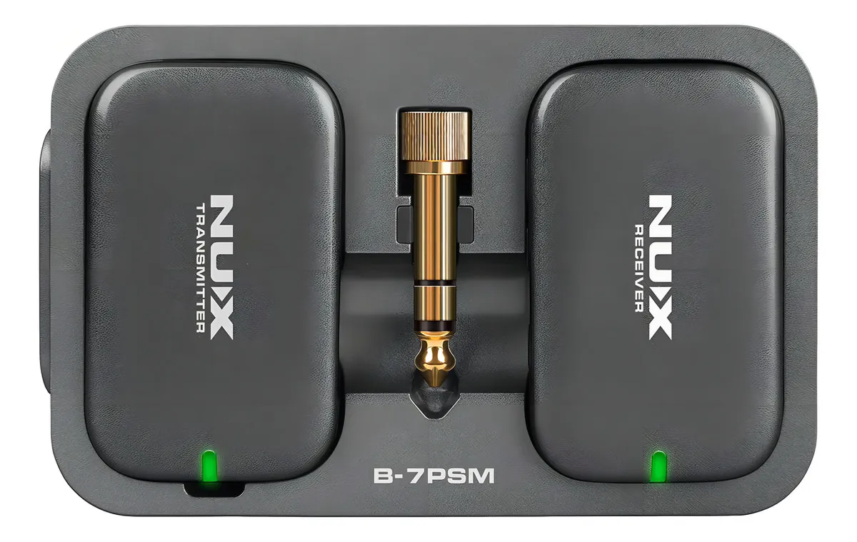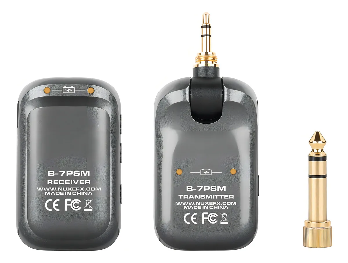 B-7PSM de NUX es un sistema de monitoreo personal in-ear con exploración automática del entorno de RF, frecuencia de transmisión libre de interferencias de 5.8 GHz y transmisión de audio estéreo de alta calidad de 24 bits / 40 kHz. Desde cualquier posición. En cualquier escenario. Escucha cada nota en detalle con este sistema de monitoreo in-ear. Encuentra rápidamente un canal inalámbrico limpio y lo asigna automáticamente. El B-7PSM ofrece una latencia súper baja de menos ee 5.5 ms y tiene un rango de operación de 27 metros cuando no hay obstrucciones entre el receptor (RX) y el transmisor (TX). El rango de operación es de aproximadamente 9 metros cuando hay alguna obstrucción. Es un sistema mini compacto inalámbrico súper ligero diseñado para usarse al instante. El TX cuenta con un conector TRS de 1/8″ (puedes usar el adaptador incluido para convertirlo a 1/4″), audio de calidad broadcasting a través de una transmisión digital de 5.8 GHz al RX compacto. El diseño de clip del RX puede ajustarse fácilmente a tu camisa, cinturón o tahalí de guitarra. Y con nuestra nueva tecnología automática de salto de frecuencia, el B-7PSM es confiable y estable mientras estás en el escenario. Al desacoplar varios sistemas B-7PSM, enciende un set primero, emparéjalo y luego enciende los otros sets secuencialmente. Para obtener los mejores resultados, el TX debe estar al menos a 1 metro del suelo, a 2 metros de los enrutadores Wi-Fi y las paredes o superficies metálicas para minimizar las reflexiones. El sencillo sistema de emparejamiento lo hace muy fácil de usar, solo enciende ambas unidades inalámbricas /TX y RX), luego se emparejarán en un par de segundos. Cada set inalámbrico tiene un algoritmo de emparejamiento único, se detecta automáticamente entre sí y configura sus propias IDs. La señal nunca interfiere con ninguna otra conexión inalámbrica, incluida la señal WiFi. Se recomienda mantenerse a 2 metros de distancia del enrutador WiFi para obtener mejores resultados. Conecta el TX a una mezcladora en vivo o personal y enciende el TX (el indicador LED se mostrará en verde). Luego conecta tus audífonos internos con el RX, enciende el RX para emparejarlo con el TX. El indicador LED será verde continuo. Ahora está listo para funcionar. Precaución: No te coloques los in-ears en tus oídos antes de comenzar a ajustar el volumen, puedes dañar tus oídos si el volumen es demasiado alto. Puedes ajustar el volumen RX en incrementos de 0.5 dB con los botones + y -. El volumen máximo es 0 dB y el mínimo es -64 dB. Si mantienes presionado el botón + o -, puedes aumentar o disminuir el volumen rápidamente. El B-7PSM ofrece transmisión de audio estéreo, por lo que es perfecto para trabajar con mezcladoras personales profesionales para panoramizar los tracks como desees en el escenario o en el estudio durante los ensayos y presentaciones en vivo. El B-7PSM presenta una calidad de sonido superior con un rango dinámico de 92 dBa y una respuesta de frecuencia de 20 – 19 kHz. Nota: Presiona brevemente el botón de encendido del RX para volver a la configuración de volumen predeterminada. Puede ser demasiado alto si los in-ears son muy sensibles. Baja el volumen de la mezcladora y auméntalo con cuidado. Te recomendamos que uses in-ears o audífonos con una impedancia de 16-32 ohms para obtener la mejor experiencia. Puedes cargar las unidades RX y TX con el estuche de almacenamiento recargable o usando el cable USB-C para cargar. Ambas unidades pueden funcionar mientras se cargan por si acaso.