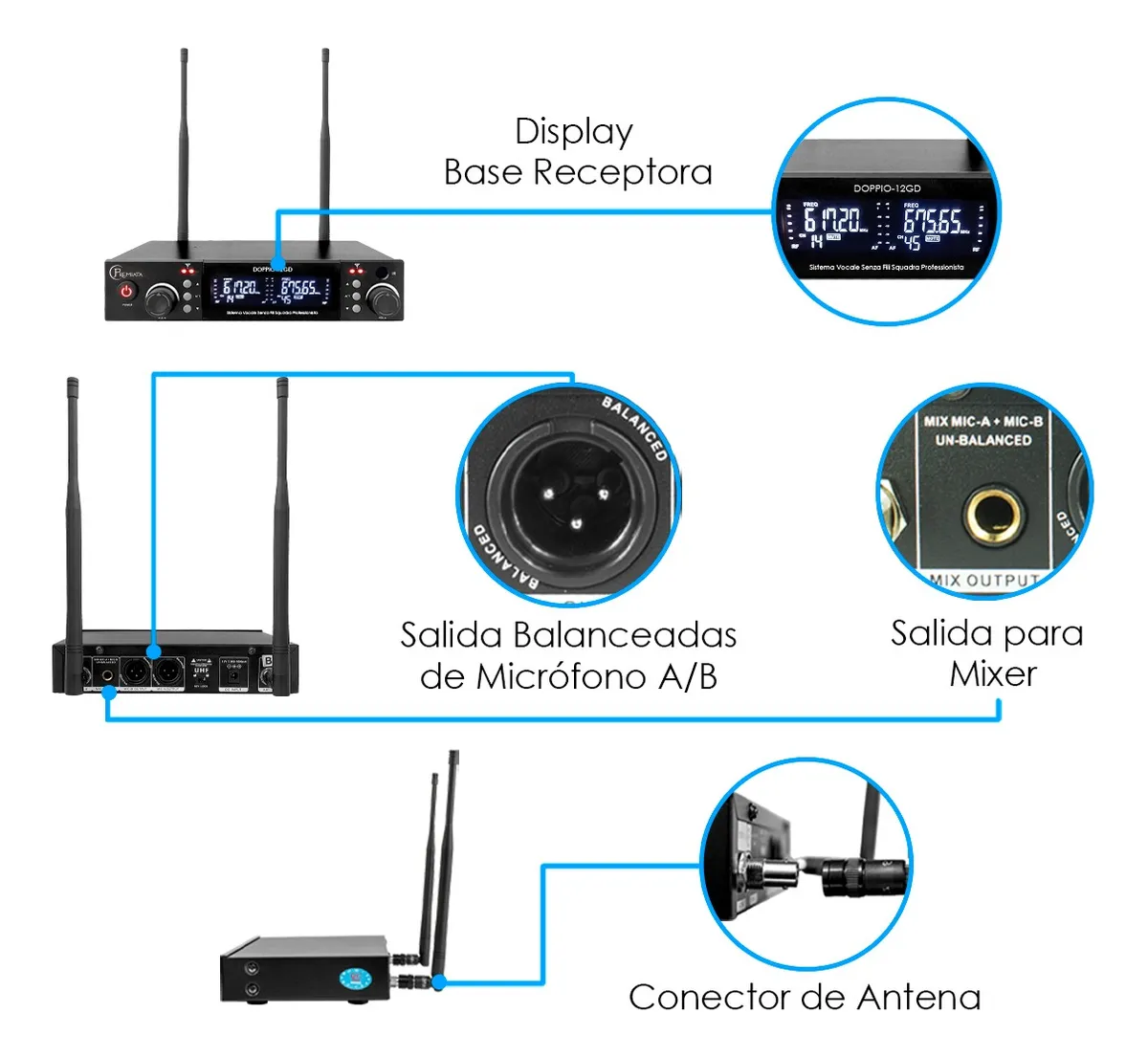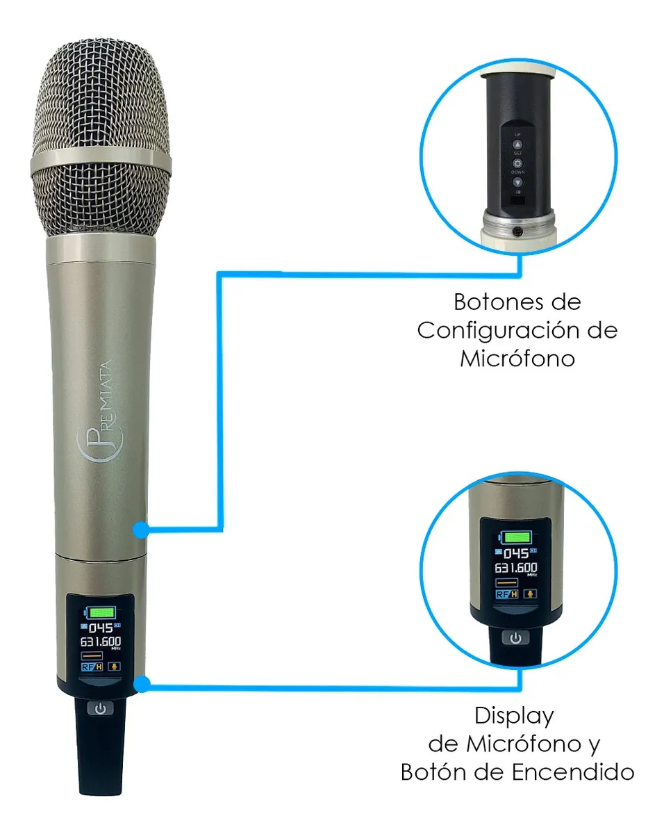 - Doble Canal UHF: Permite el uso de dos micrófonos de mano de forma independiente con frecuencias programables para evitar saturación.