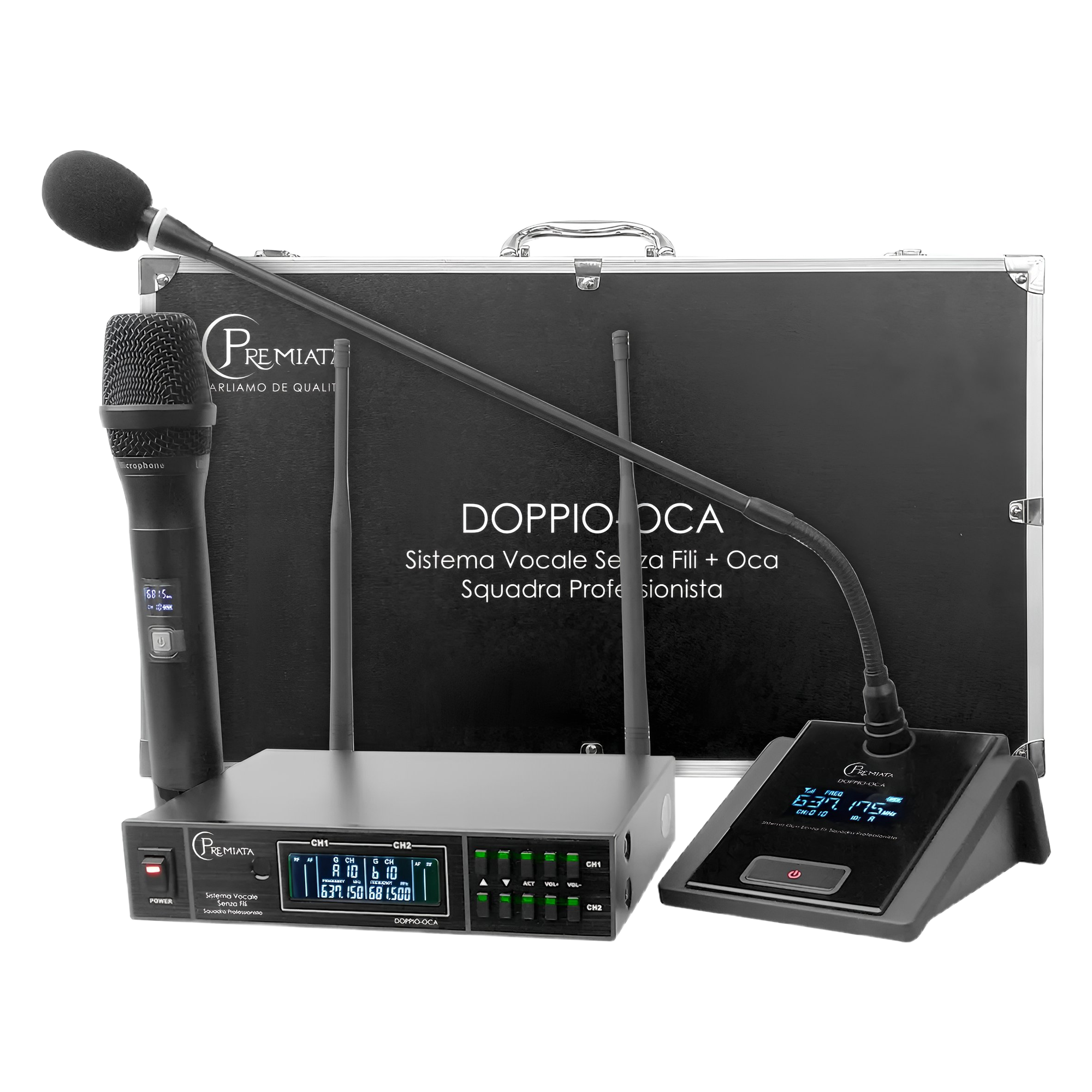 El Sistema Vocale Senza Fili Premiata Mod. DOPPIO-OCA SQUADRA es la solución perfecta para duetos, conferencias y eventos que requieren dos voces simultáneas sin cables. Este sistema destaca por su facilidad de configuración y su receptor de alta sensibilidad que garantiza una cobertura amplia y libre de interferencias. El modelo DOPPIO-OCA cuenta con micrófonos ergonómicos de cápsula dinámica optimizados para la voz humana, entregando una respuesta clara y presente. Con su tecnología SQUADRA integrada, este sistema asegura una sincronización precisa y una durabilidad profesional para el uso constante en escenarios, iglesias o salones de eventos.