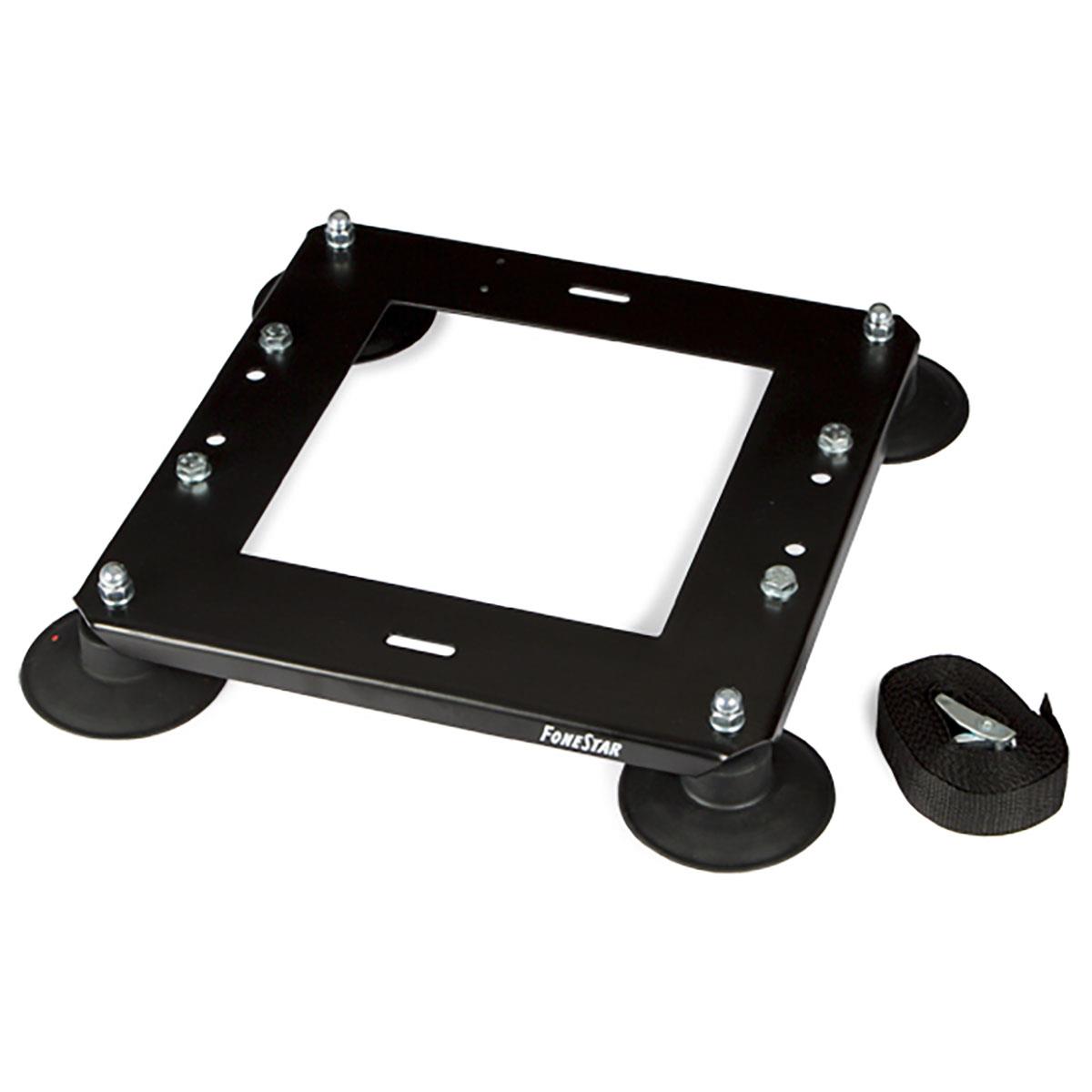 Soporte cuadrado porta altavoces con ventosas y correa ajustable de seguridad, para instalar en techo de coche, furgoneta, etc. Con orificios para altavoces exponenciales modelos. FE-1210, FE-107, FE-149 o similares. Se monta y desmonta con gran facilidad y rapidez en cualquier tipo de vehículo.