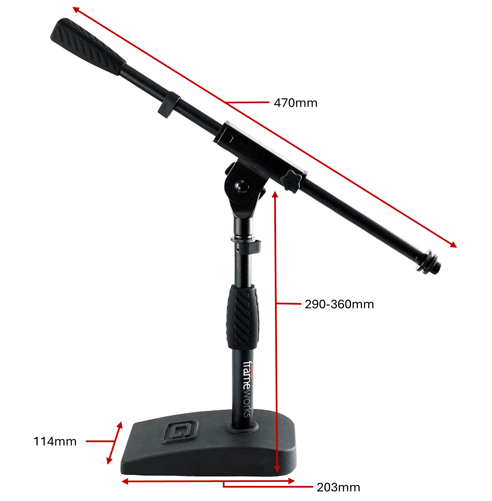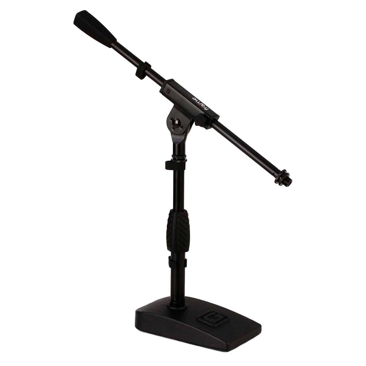 Soporte compacto con base pesada de 4.5″ x 8″ ideal para bombo, amplificadores y aplicaciones de escritorio. Altura ajustable hasta 23″ (584 mm) con brazo de pluma de 16″ para posicionamiento preciso. Construcción en acero resistente, embrague ergonómico de agarre suave y gestión de cables integrada. Compatible con clips de micrófono estándar de EE.?UU. y Europa. Junta antideslizante en la base para reducir vibraciones y mejorar la calidad del audio.