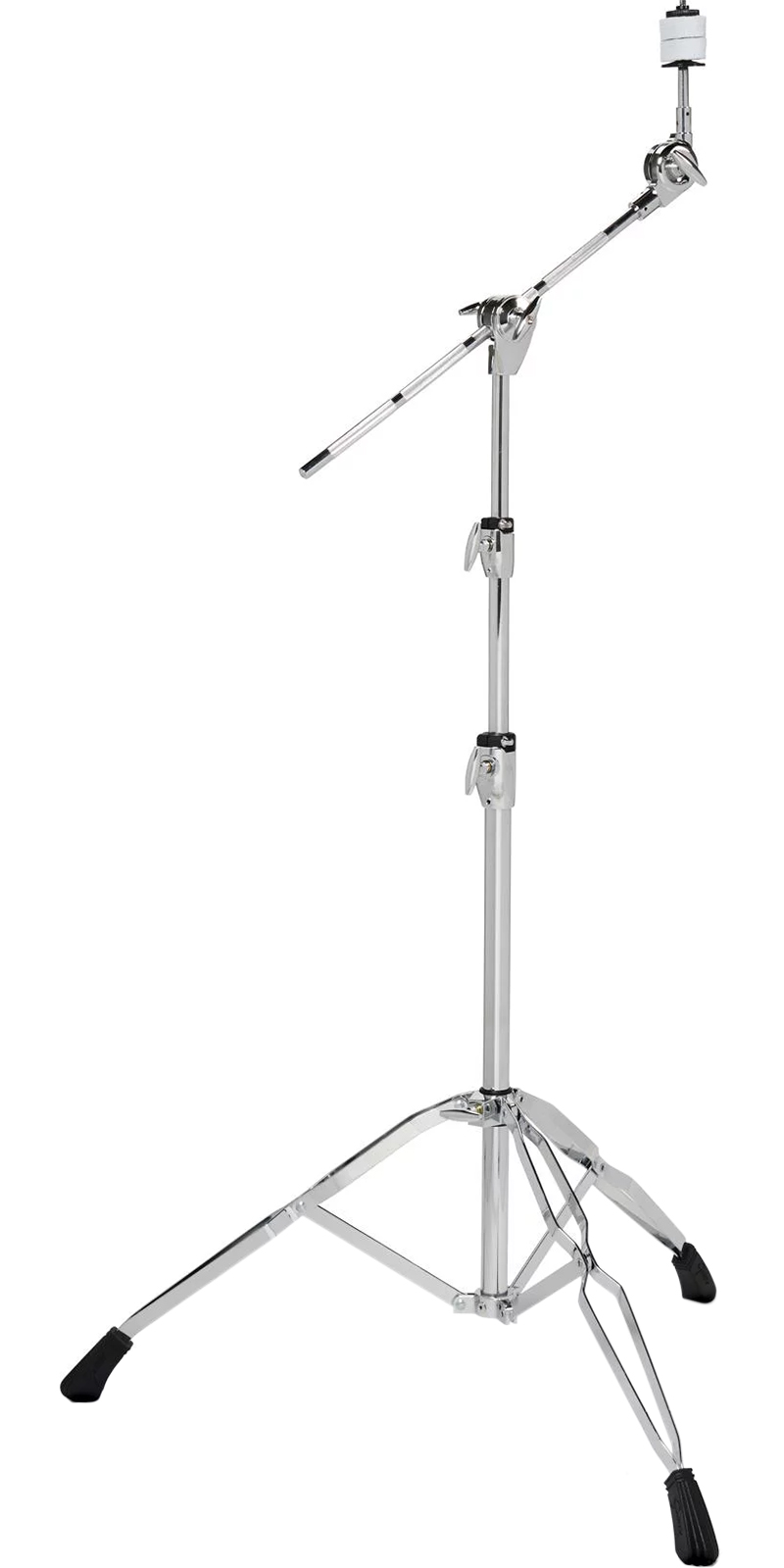 Soporte para platillo con boom, terminado cromado, altura ajustable de 3 segmentos con acción de suave desplazamiento y ajuste, diseño trípode reforzado de doble solera de 3 mm, bujes aisladores de hule liso, boom de 1/2 con sistema dentado de ajuste de inclinación, mariposas en forma de T, clásicos fieltros blancos de Gretsch, seguros de memoria de compuesto de fibra de nylon, patas de goma.