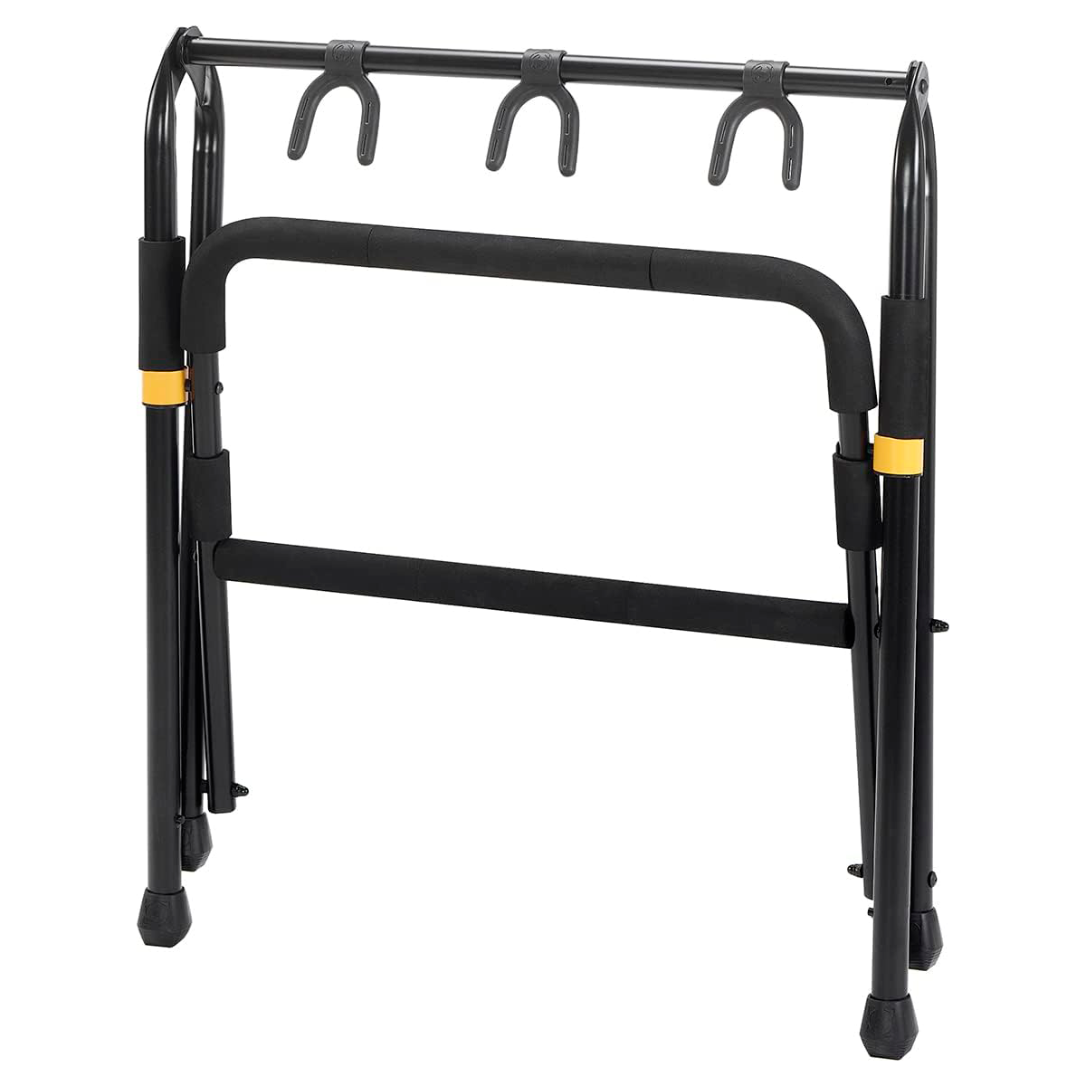 Soporte multi-guitarra con ruedas, diseñado para 3 guitarras (expandible a 6 con HA205). Ofrece estructura robusta, acolchado SFF protector, y configuración móvil o fija. Dimensiones: 715 mm de altura, 670 × 550 mm de base, peso 4.3 kg, capacidad 80 kg, tamaño plegado 630 × 110 × 710 mm.