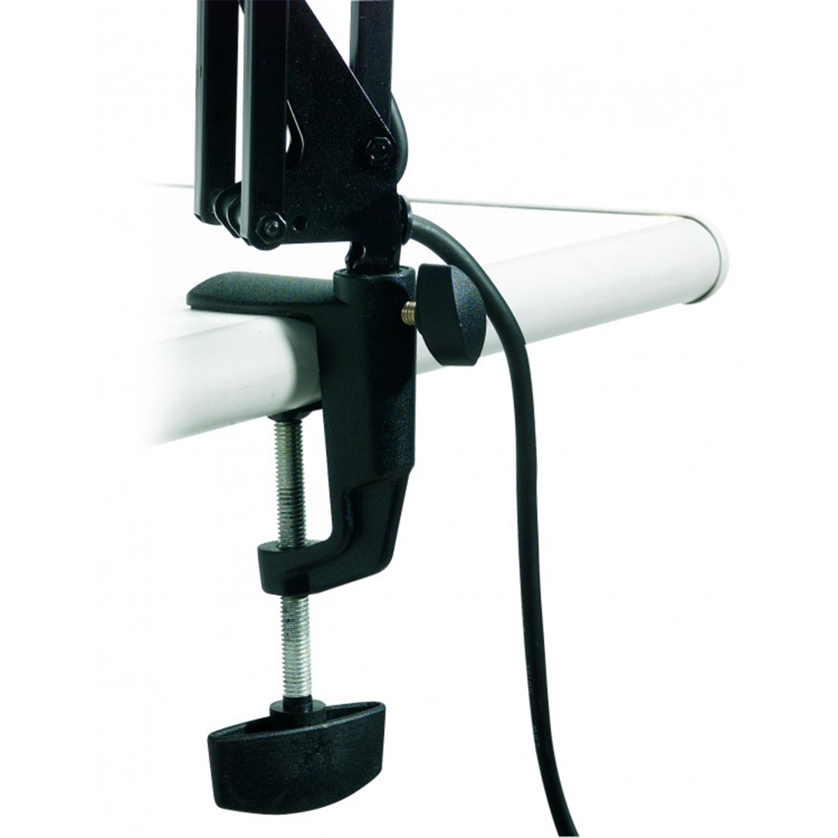 Soporte extensible para micrófono con base fija para escritorio y soporte de pinza para escritorio. Sugerido para instalaciones de radio y estudios de doblaje. Incluye cable XLR-XLR de 5 metros.