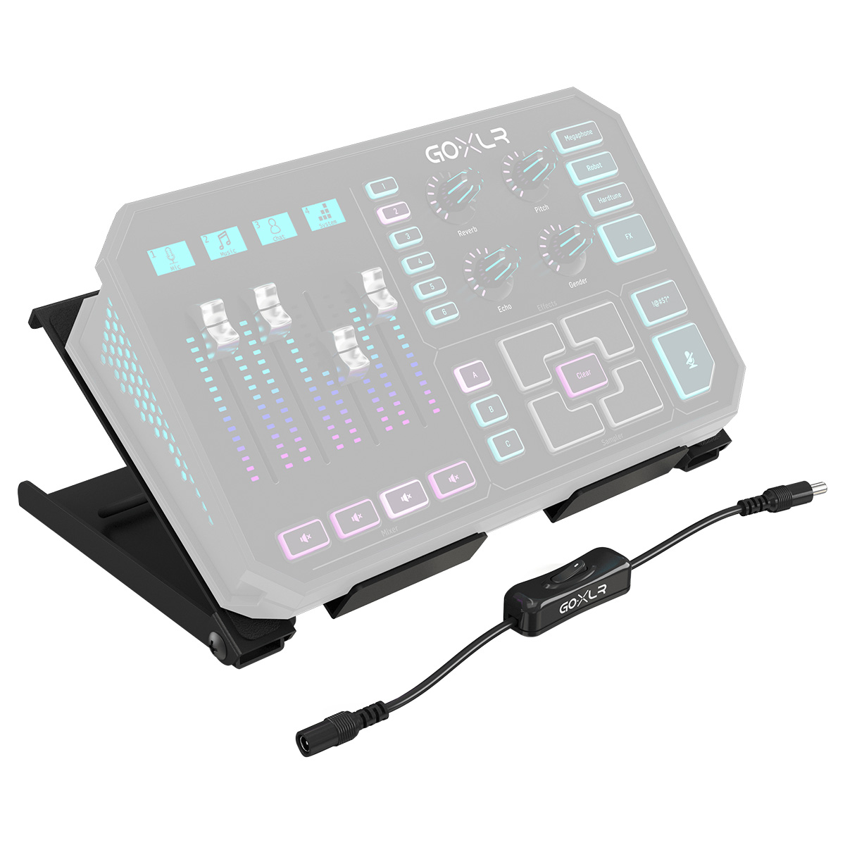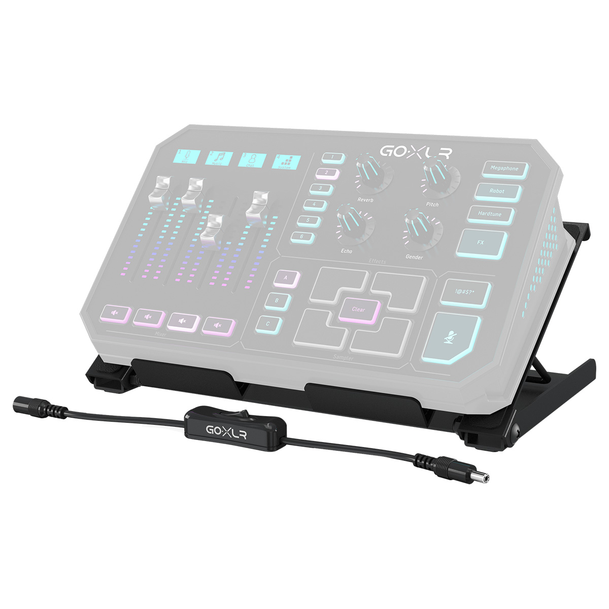 GoXLR se encuentra en una variedad tan amplia de ubicaciones y configuraciones, que sería imposible adaptarse perfectamente a todas las situaciones. Por lo tanto, creamos el soporte de escritorio GoXLR para ayudarte a obtener el ángulo de visualización y operación óptimo para tus necesidades específicas. Fabricado con una construcción totalmente metálica, el soporte aguantará cualquier cosa que le arrojes, pero no le arrojes nada, también tiene sentimientos. Creamos el soporte a propósito para que fuera pesado, con patas de goma para que no se mueva. Cuando tienes todo donde quieres, lo último que quieres es que tu equipo se deslice mientras presionas los botones. Tu enfoque debe estar en tu transmisión, tu podcast y tu audiencia, no en tu equipo. Con cuatro ángulos discretos para elegir, puedes encontrar el que mejor se adapte a tu línea de visión, ya sea que estés de pie, sentado o corriendo en una caminadora. La colocación perfecta del acolchado de goma garantiza que tu GoXLR no roce ni roce contra el soporte. Muchos de nuestros productos para músicos no tienen un switch de encendido, ya que el cable se desconecta al final de la actuación. Hemos diseñado GoXLR con la misma configuración de alimentación, por lo que es perfectamente seguro tirar del cable de alimentación cuando deseas apagarlo. Algunos músicos querían un switch On/Off más típico, por lo que incluimos un switch de alimentación en línea con el soporte de escritorio. Simplemente conecta tu adaptador GoXLR al switch y el switch a tu GoXLR.