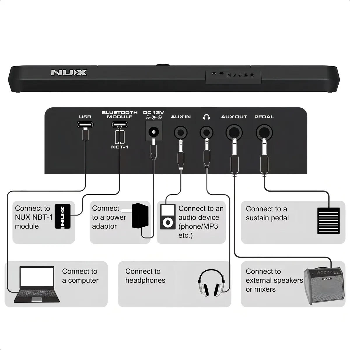 NUX NEK-100 — Teclado digital portátil de 61 teclas con batería recargable y Bluetooth