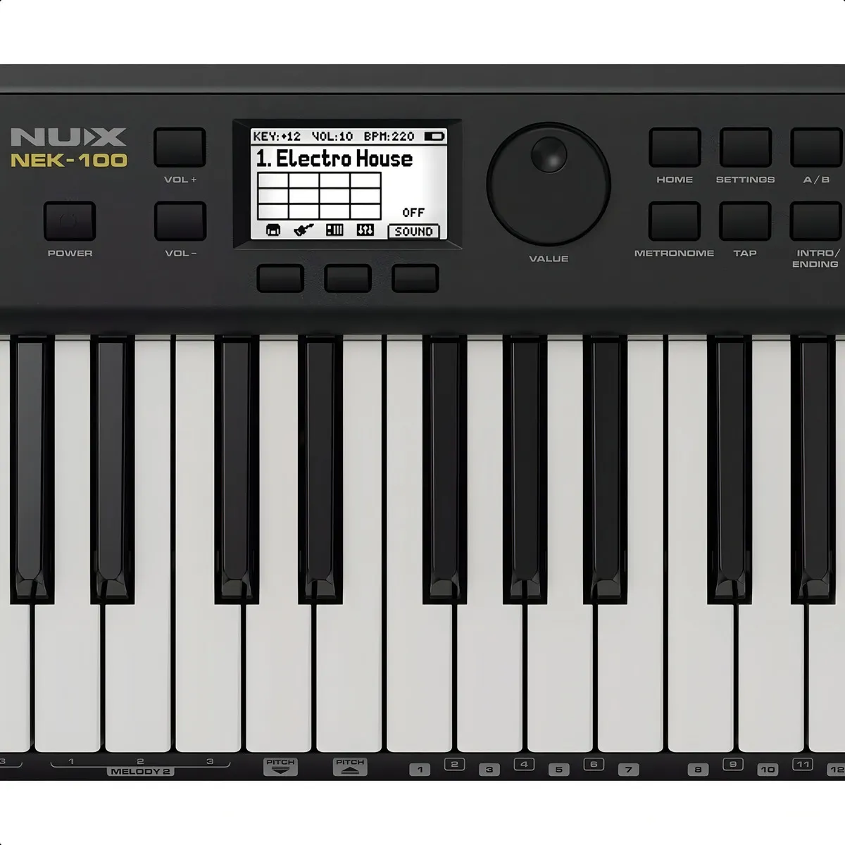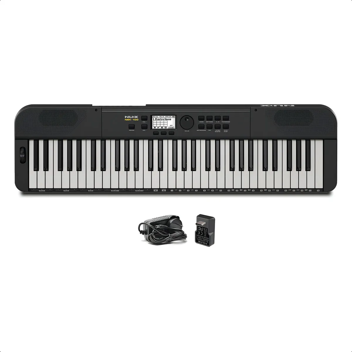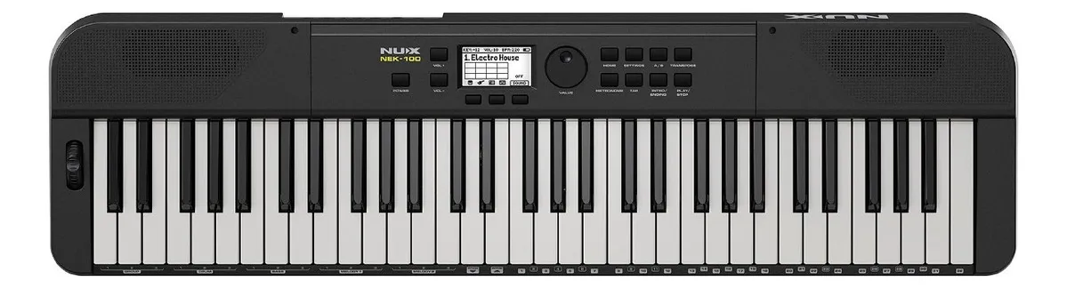 NUX NEK-100, teclado digital portátil de 61 teclas con batería recargable de larga duración, 500 sonidos, 100 estilos de acompañamiento y conectividad Bluetooth y USB-C. Perfecto para tocar en vivo o en casa, ofrece controles intuitivos, efectos integrados y un modo Música en Vivo para interpretaciones dinámicas, todo en un diseño ligero y compacto.