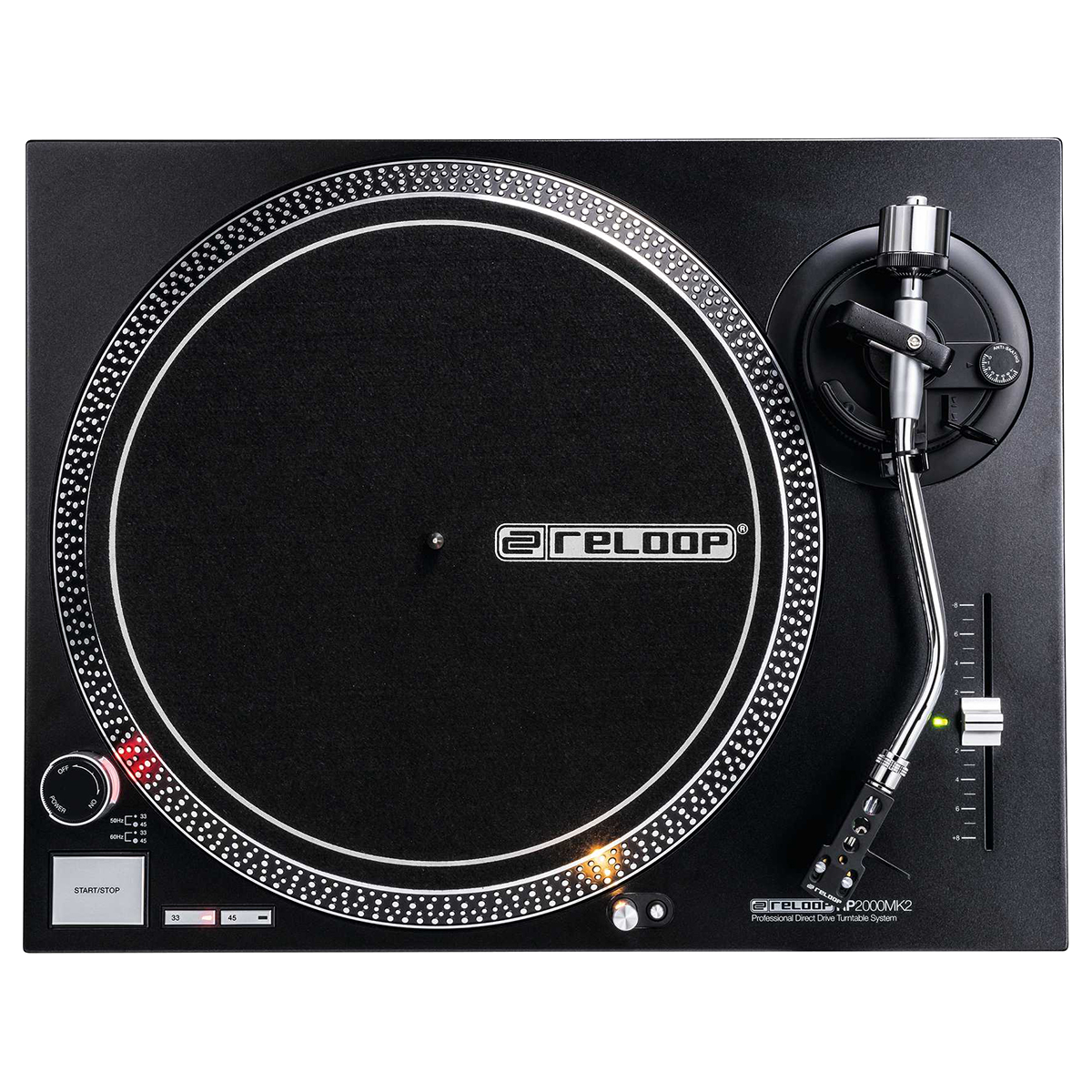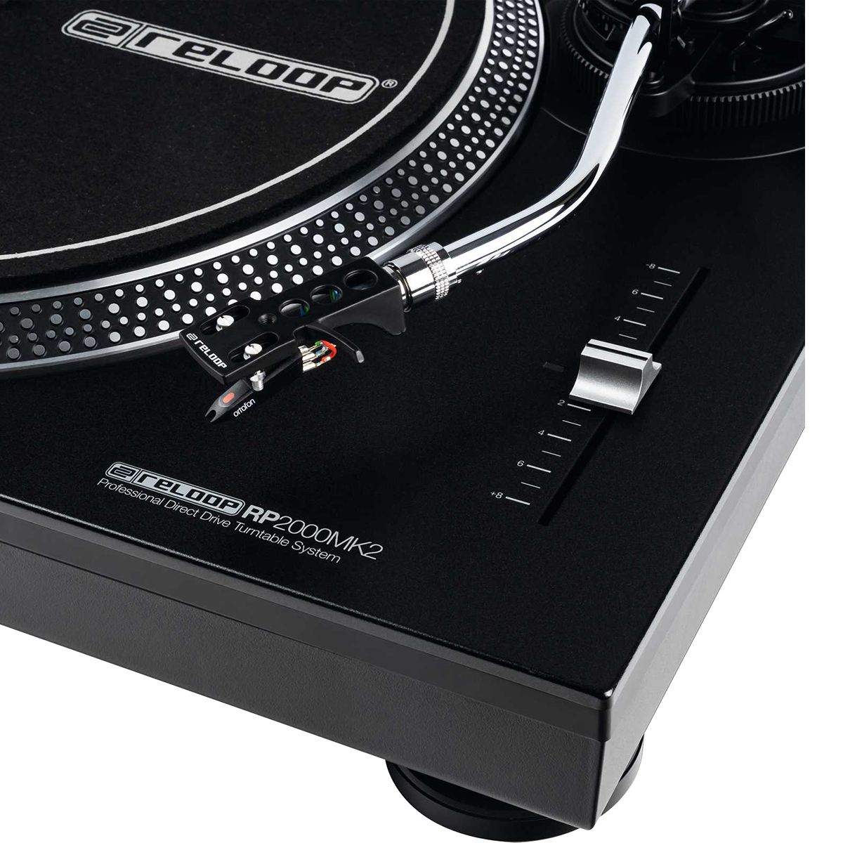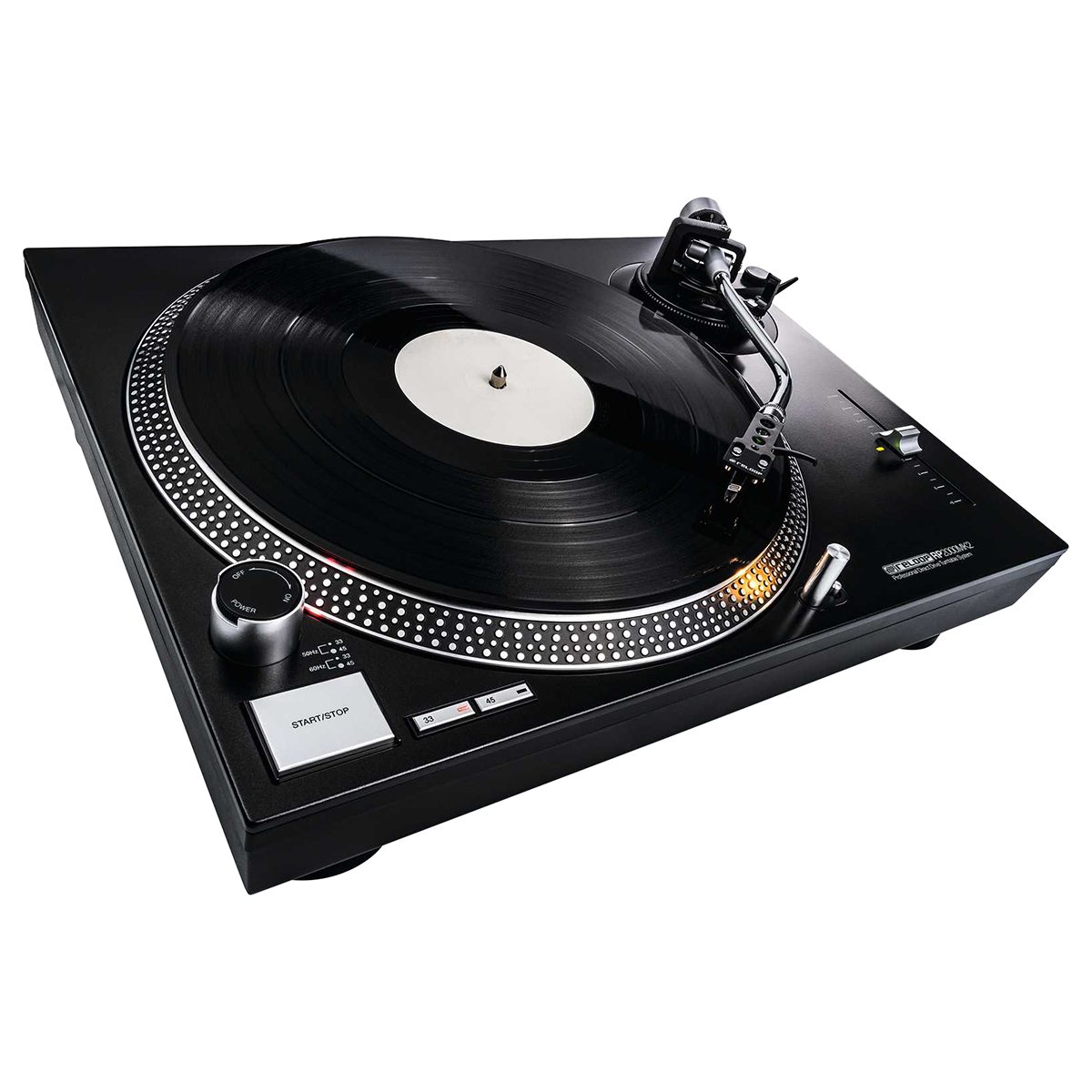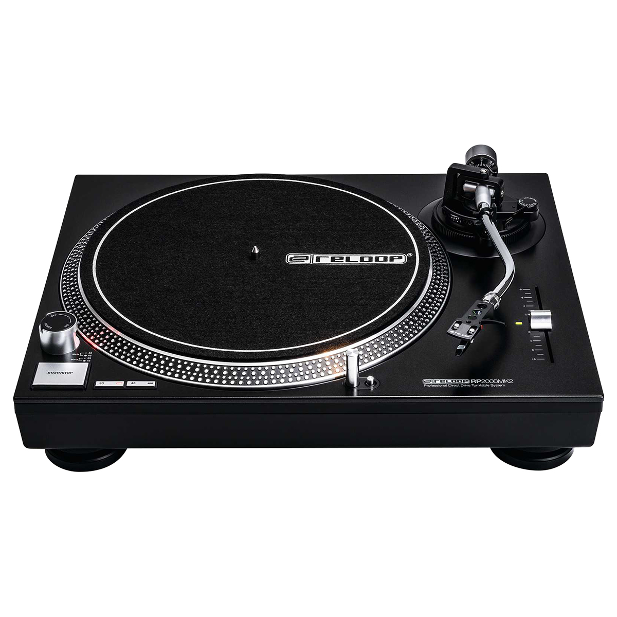 El RP-2000 MK2 es un tornamesa confiable para futuros DJ. La versión MK2 presenta varias mejoras, incluyendo una construcción recientemente desarrollada de panel superior y botones metálicos mejorados con una sensación mejorada. En comparación con los tornamesas belt-driven, el RP-2000 MK2 transfiere la fuerza del motor directamente al eje de transmisión, de esta manera, un torque más alto genera potencia más rápido en el plato diseñado con precisión con un mínimo de fluctuaciones y vibraciones. El control de tono ajustable con un rango de +/- 8 % es adecuado para los ajustes de tono más finos. El RP-2000 MK2 cuenta con un brazo de tono en forma de S equilibrado estáticamente con elevación hidráulica y mecanismo antideslizante. Gracias a la conexión SME universal, se pueden conectar una gran cantidad de cartuchos pick-up. Una cubierta anti polvo está disponible como accesorio adicional (no incluido). El nuevo panel superior metálico de color negro intenso está equipado con botones metálicos para los ajustes de Start/Stop y velocidad. El toque mejorado tras golpe ofrece una retroalimentación háptica clara. Con solo presionar un botón, la luz de objetivo de aluminio se puede extender, de modo que la posición de la aguja se pueda ver en entornos oscuros. La construcción robusta con características de amortiguación optimizadas y pues amortiguadores, mejoran el aislamiento de vibraciones no deseadas.