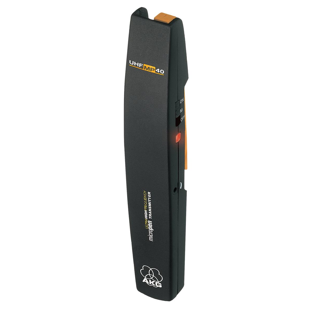 El MP 40 es un emisor miniatura con un micrófono de condensador C407 desmontable y con característica omnidireccional. El emisor ha sido desarrollado especialmente para la transmisión de palabra en combinación con los receptores del sistema WMS 40 de AKG. El MP 40 micro pen funciona con una frecuencia UHF de 710 a 865 MHz y a antena dipolo integrada en la caja.