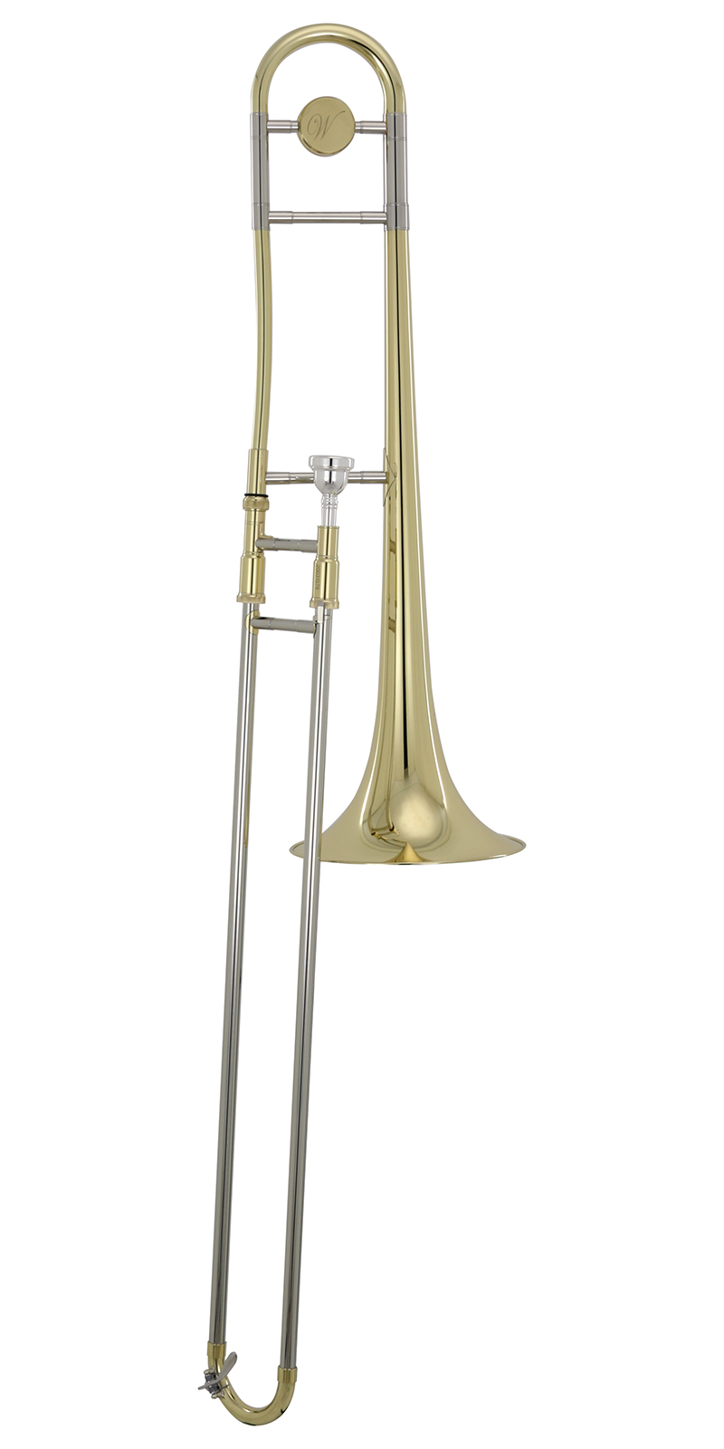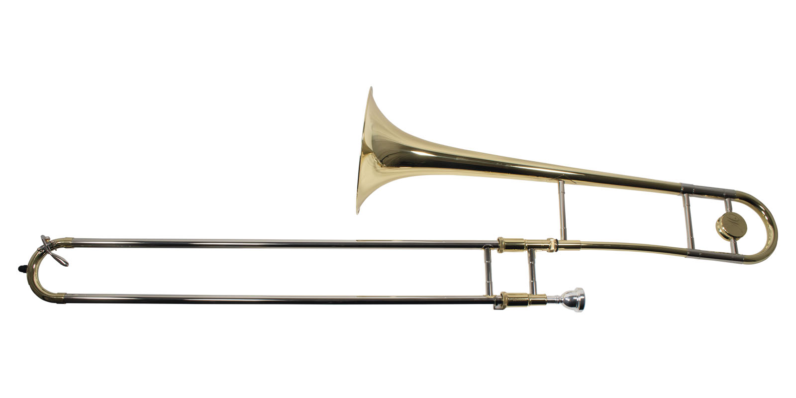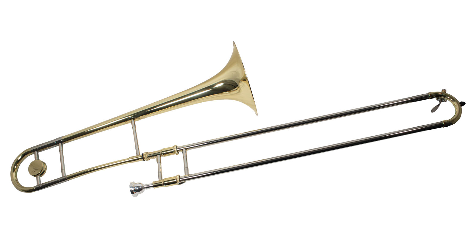 Trombón estándar, tonalidad en Bb, latón laqueado, bomba interna de cuproniquel, campana de 203 mm, orificios de 12.7 mm, incluye boquilla y estuche ligero de lona.