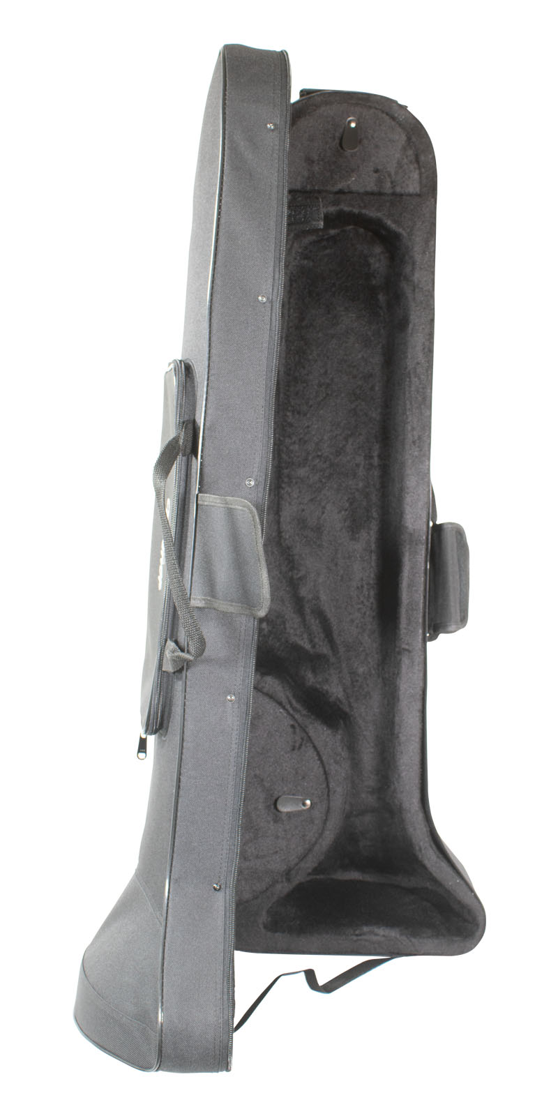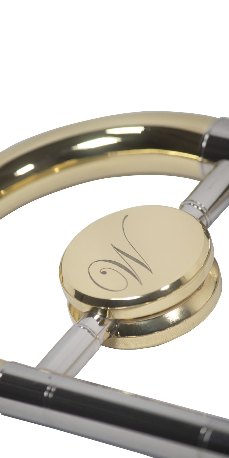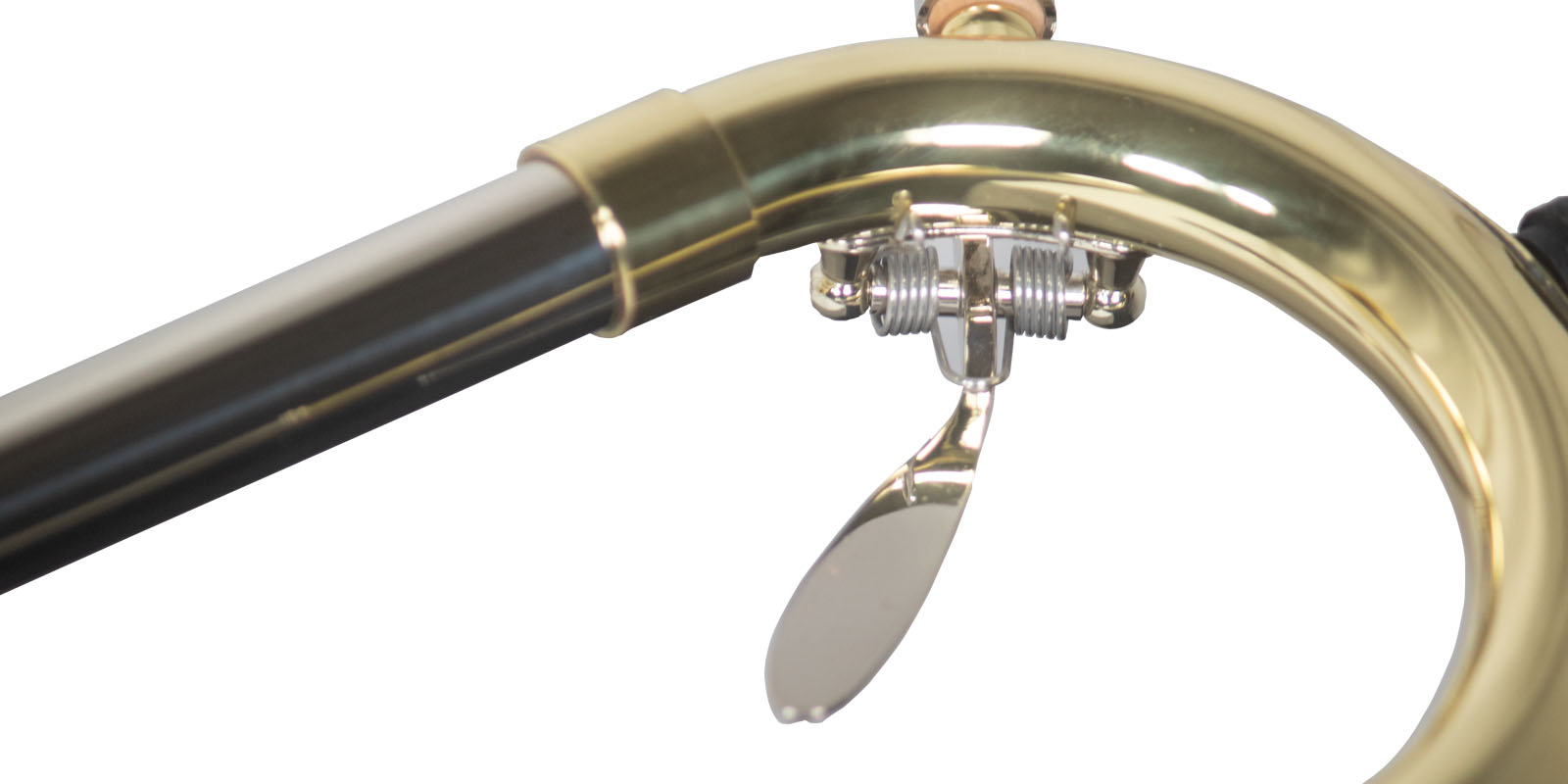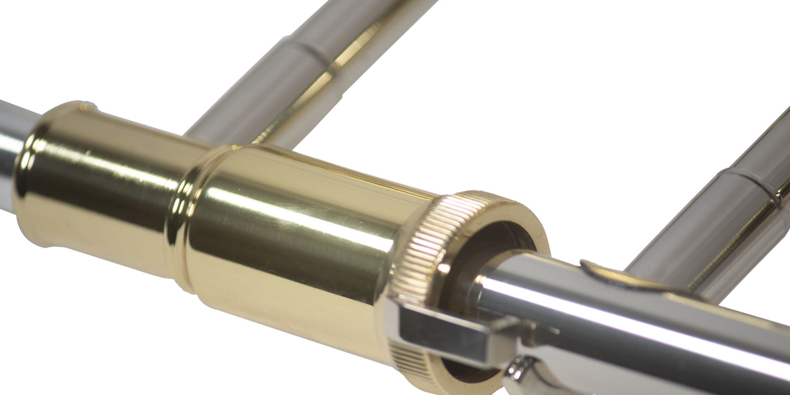Trombón estándar, tonalidad en Bb, latón laqueado, bomba interna de cuproniquel, campana de 203 mm, orificios de 12.7 mm, incluye boquilla y estuche ligero de lona.