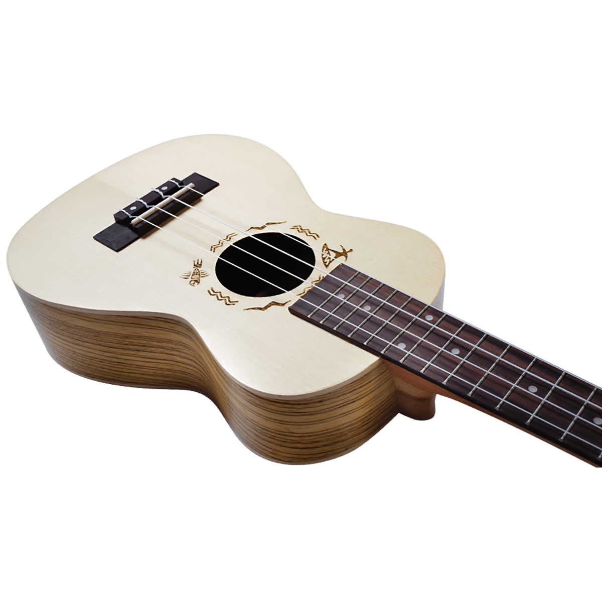 Abeto Englemann & Zebrawood. La tapa de abeto europeo Engelmann y los aros de zebrawood se combinan para proporcionar un sonido agudo y potente cuando tocas soleas en el registro agudo y cálido y aterciopelado cuando rasgueas cuidadosamente. Finalmente, puedes tenerlo en ambos sentidos. Las rosetas en todos nuestros Ukuleles se dibujan a mano y se graban con láser. Cada modelo tiene un diseño único. ¿Cuál es tu favorito?