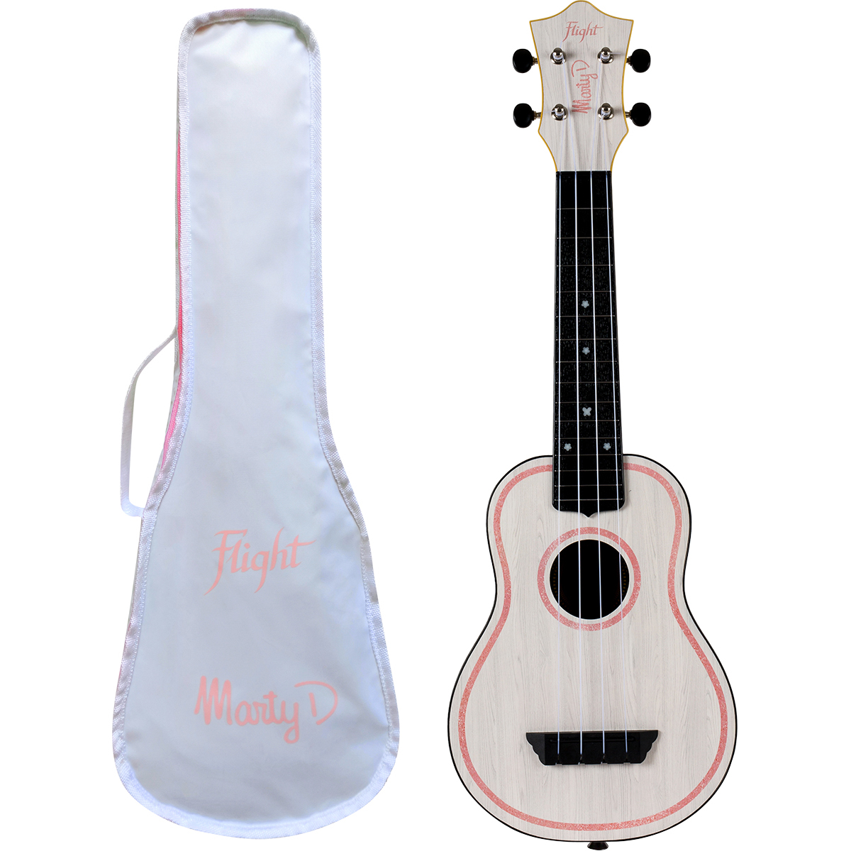 Siempre listo para el show. Todos los ukes Flight Travel cuentan con una funda de color azul denim, pero Marty, como una verdadera princesa, quería una diferente, muy linda de color blanco con ribete rosa.