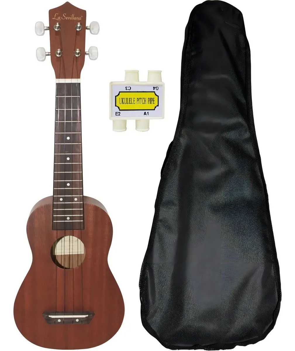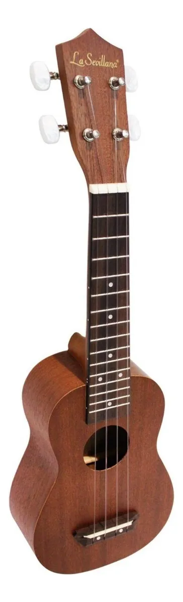 Ukelele soprano, tapa, aros y fondo de fina caoba, diapasón y puente de palo de rosa, maquinaria cromada, 12 trastes, cuerdas D’Addario, incluye funda de nylon y afinador de silbato.