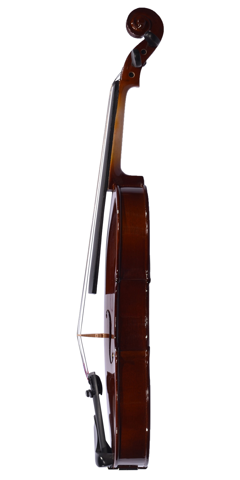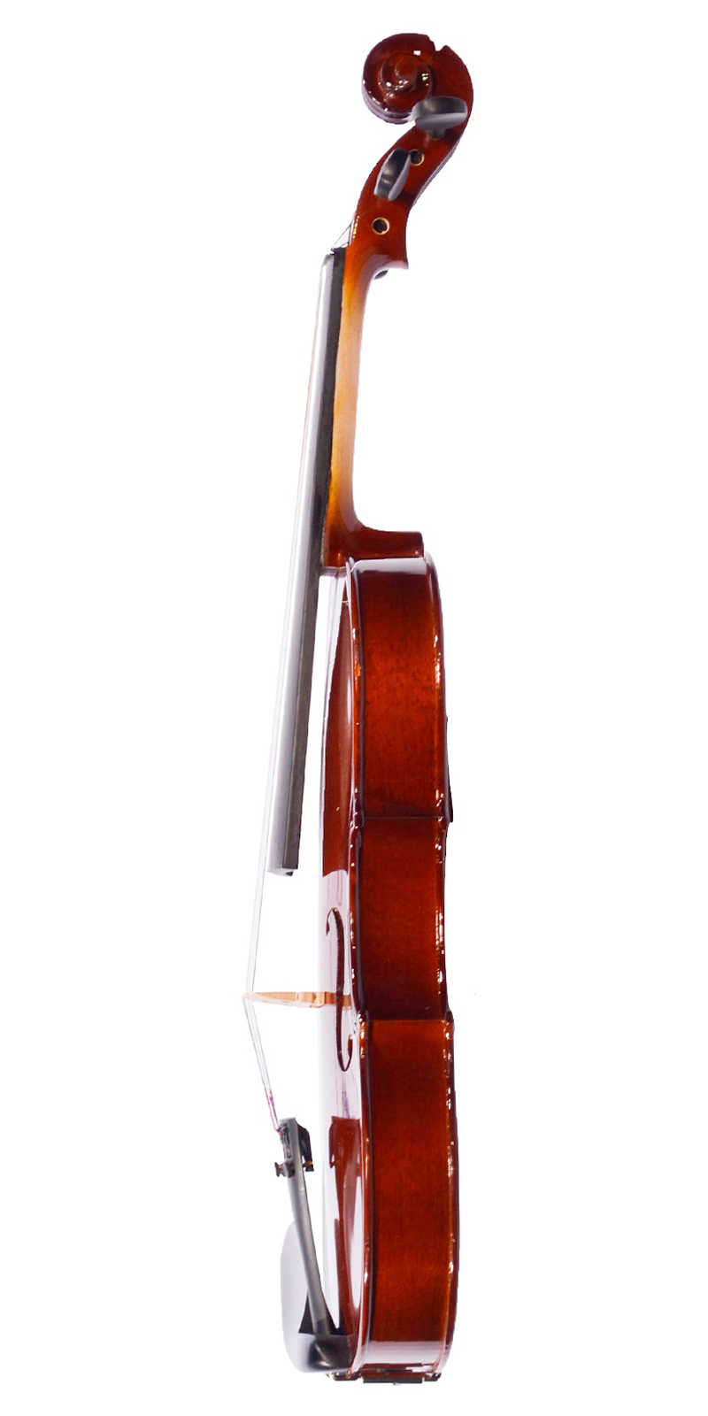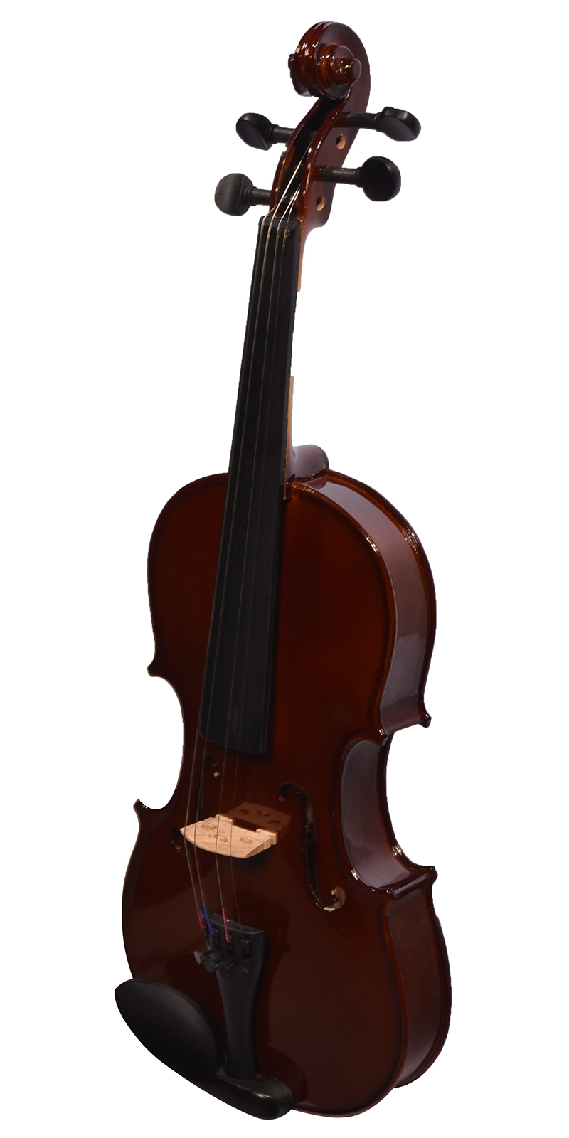 Violín de 4/4, tapa de abeto sólido (laminado), aros y fondo de maple sólido (laminado), brazo de maple sólido, diapasón, barbada y clavijas de hardwood negro, cordal metálico con 4 tornillos de ajuste fino, filetes incrustados, incluye arco de pernambuco con crin de caballo, puente de maple y estuche.